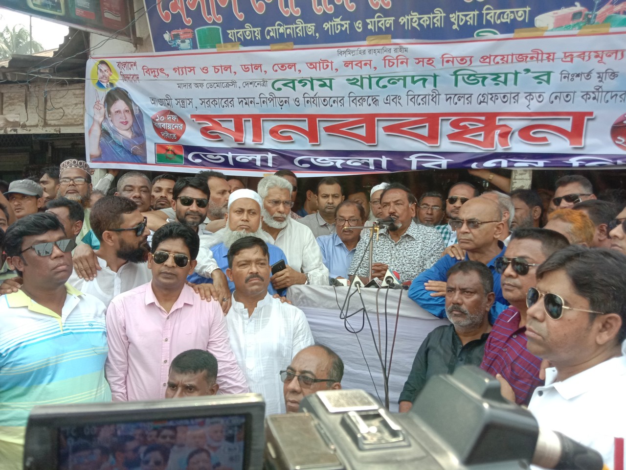 জেলা বিএনপির আহবায়ক গোলাম নবী আলমগীরের সভাপতিত্বে মানববন্ধন সমাবেশে আরো বক্তব্য রাখেন, বিএনপির নির্বাহী কমিটির সদস্য ,ভোলা-৪ আসনের সাবেক সংসদ সদস্য নাজিম উদ্দিন আলম, জেলা বিএনপির সিনিয়র যুগ্ন আহবায়ক শফিউর রহমান কিরণ, সদস্য সচিব রাইসুল আলম, জেলা বিএনপির সাবেক সিনিয়র সহ-সভাপতি আমিনুল ইসলাম খান, সাধারণ সম্পাদক হারুন অর রশি ট্রুম্যান,সাবেক সিনিয়র যুগ্ম সম্পাদক হুমায়ুন কবির সোপান, সাবেক সাংগঠনিক সম্পাদক এনামুল হক ,ভোলা সদর উপজেলা বিএনপির আহবায়ক আসিফ আলতাফ প্রমুখ।
