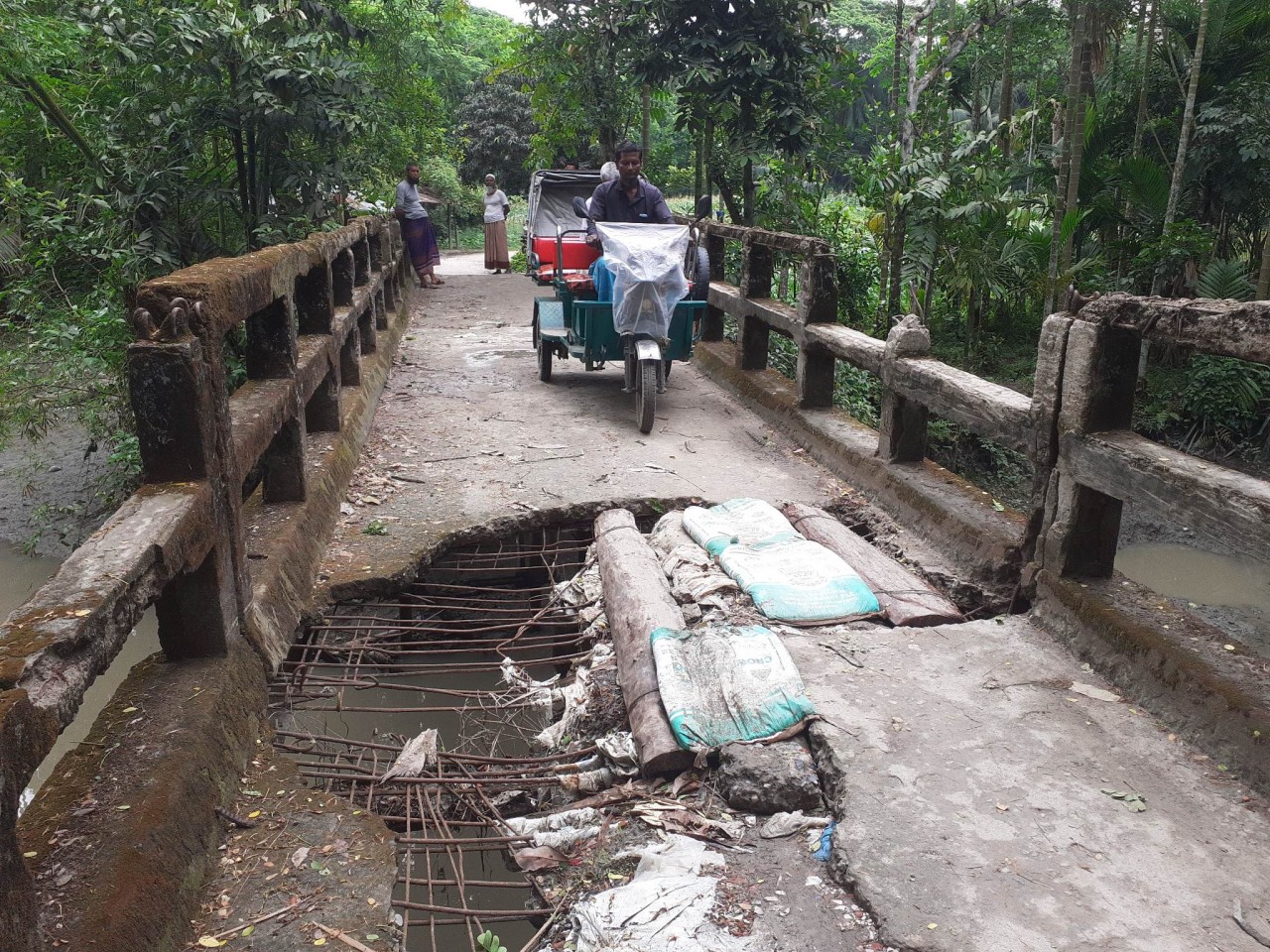 জানা গেছে, লালমোহন পৌর শহর থেকে মাত্র দুই কিলোমিটার দূরে প্রায় ৩৫ বছর আগে এই ব্রিজটি নির্মাণ হলেও বর্তমানে বয়সের ভারে ব্রিজটি গত ৫ বছর ধরে বেহাল দশা। ব্রিজের মাঝের বেশির ভাগ অংশের পলেস্তরা খসে পড়ে যাওয়ায় রডগুলো বেরিয়ে এসেছে। ব্রিজটির কোন প্রান্তেই ‘ঝুঁকিপুর্ণ’ কিংবা ‘সাবধান’ লেখা সতর্কতা সাইনবোর্ড টানানো নেই। ব্রিজের নিচের লোহার প্রায় এঙ্গেল ভেঙ্গে পড়ে আছে আর উপরের অংশের ইট বালি সিমেন্টের ঢালাই নাজুঁক। এরপরও ব্রিজটির ওপর দিয়ে ঝুঁঁকি নিয়ে ছোট যানবাহন ও এলাকাবাসী চলাচল করছে। যে কোন যানবাহন উঠলেই ব্রিজটি কেঁপে ওঠে। ঝুঁকিপূর্ণ এ ব্রিজ ভেঙ্গে নতুন ব্রিজ নির্মাণের দাবি স্থানীয়দের।