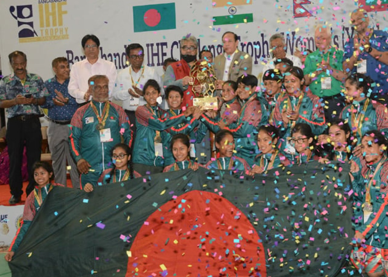 বঙ্গবন্ধু আইএইচএফ চ্যালেঞ্জ ট্রফি ওমেন্স টুর্নামেন্টের ইয়ুথ বিভাগে (অনূর্ধ্ব-১৭) চ্যাম্পিয়ন হয়েছে বাংলাদেশের মেয়েরা। আজ বুধবার শহীদ (ক্যাপ্টেন) এম মনসুর আলী জাতীয় হ্যান্ডবল স্টেডিয়ামে অনুষ্ঠিত ফাইনালে ভারতকে ৪৬-৪৩ গোল ব্যবধানে হারিয়ে চ্যাম্পিয়ন হয় স্বাগতিক মেয়েরা। প্রতিদ্বন্দ্বিতাপুর্ন ম্যাচের প্রথমার্ধে ২০-২০ গোলের সমতায় মাঠ ছাড়ে দু’দল।