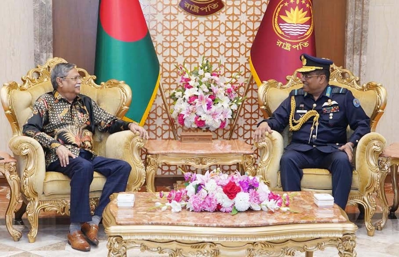 রাষ্ট্রপতি মোঃ সাহাবুদ্দিনের সঙ্গে আজ দুপুরে বঙ্গভবনে সৌজন্য সাক্ষাৎ করেছেন বিমান বাহিনী প্রধান এয়ার চিফ মার্শাল শেখ আব্দুল হান্নান।