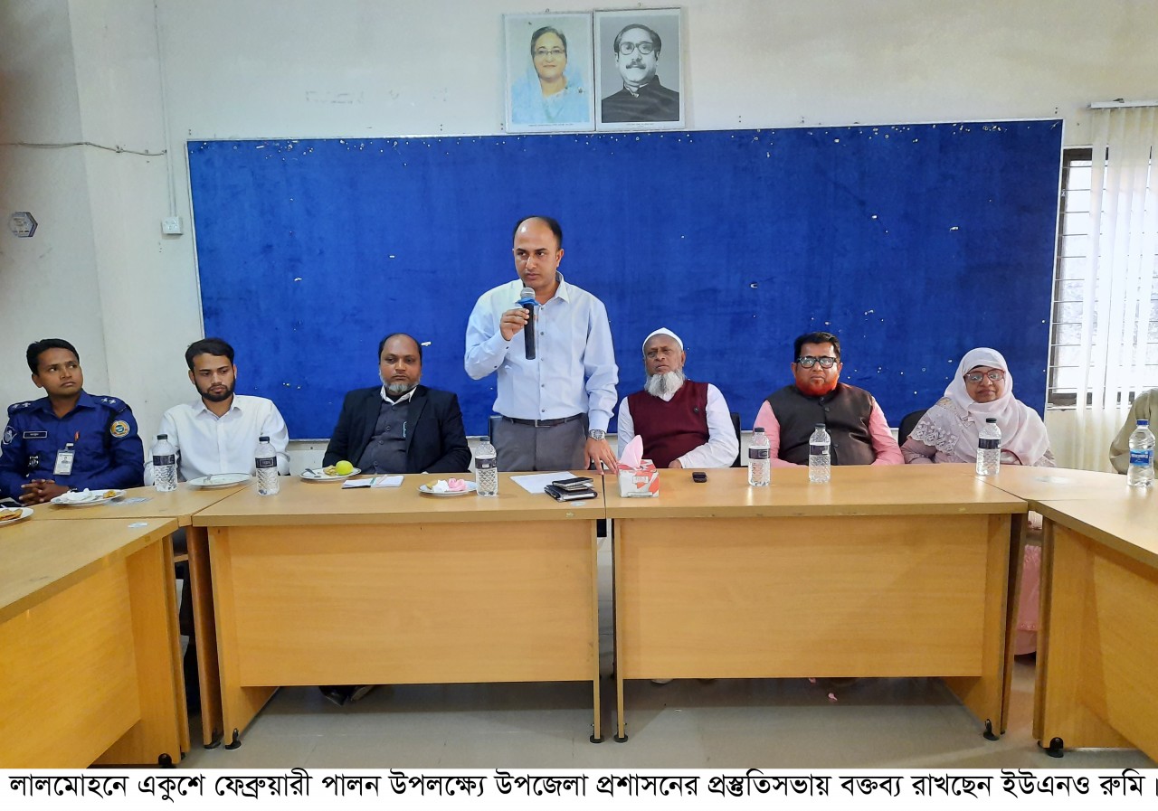 লালমোহন প্রতিনিধি : লালমোহনে মহান একুশে ফেব্রæয়ারী আন্তর্জাতিক মার্তৃভাষা দিবস পালন উপলক্ষ্যে প্রস্তুতি সভা করেছে উপজেলা প্রশাসন। সোমবার বিকেলে উপজেলা পরিষদ মিলনায়তনে আলোচনা সভার সভাপতিত্ব করেন উপজেলা নির্বাহী অফিসার হাবিবুল হাসান রুমি। এসময় উপস্থিত ছিলেন সরকারী শাহবাজপুর কলেজের অধ্যক্ষ ড. শফিকুল ইসলাম, উপজেলা আওয়ামী লীগের সাধারন সম্পাদক ফখরুল আলম হাওলাদার, সাবেক সম্পাদক দিদারুল ইসলাম অরুন, উপজেলা ভাইস চেয়ারম্যান মাসুমা বেগম, ইউপি চেয়ারম্যান আবুল কাশেম মিয়া, আবুল বশার সেলিমসহ বিভিন্ন সরকারী দপ্তরের কর্মকর্তা, শিক্ষা প্রতিষ্ঠান প্রধান ও সাংবাদিকগণ উপস্থিত ছিলেন।