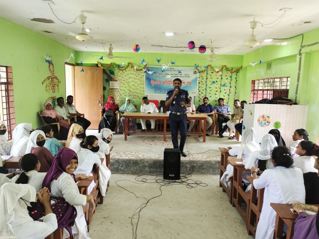 সমাজ থেকে বাল্যবিবাহ মাদক নির্মূল, নারী নির্যাতন, ইভটিজিং, কিশোর গ্যাং অপরাধ ,সাম্প্রদায়িক সহিংসতা নির্মূলে পুলিশকে তথ্য দিয়ে সহযোগিতা করার আহ্বান জানান।এসময় কলেজের অধ্যক্ষ মো:হেলাল উদ্দিন সুমন, কলেজের প্রভাষকসহ, ছাত্রীরা সভায় উপস্থিত ছিলেন।