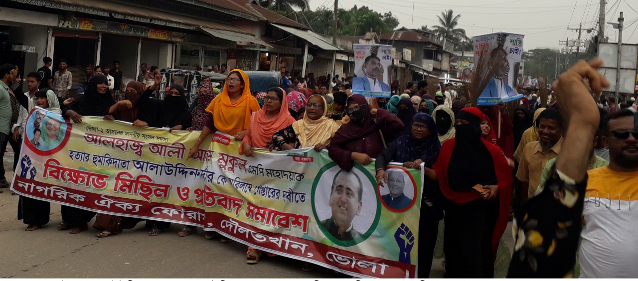 বাংলার কণ্ঠ প্রতিবেদক : ভোলা-২ আসনের সংসদ সদস্য আলী আজম মুকুলকে প্রকাশ্যে মেরে ফেলার হুমকী দেয়া ইউপি চেয়ারম্যান আলাউদ্দিনকে গ্রেফতার ও বিচার দাবিতে এবার উত্তাল দৌলতখান উপজেলা। বৃহস্পতিবার বিকালে নাগরিক ঐক্য ফোরামের ব্যানারে শিক্ষক, সাংবাদিক, জেলে, এনজিওকর্মী, ইউপি চেয়ারম্যান, নারী নেত্রী, রাজনৈতিক দলের নেতাকর্মীরা বিক্ষোভ মিছিল শেষে শহীদ মিনারের অবস্থান নিয়ে প্রতিবাদ সমাবেশ করেন। এ সময় আন্দোলনকারীদের নেতা সাবেক কলেজ অধ্যক্ষ শফিকুল মাওলা ফারুক অভিযোগ করে বলেন, সন্ত্রাসী পুত্র আটকের পর পুলিশের কাছ থেকে ছাড়িয়ে নিতে এমপির সুপারিশ না পাওয়ায় বোরহানউদ্দিন উপজেলার পক্ষিয়া ইউপি চেয়ারম্যান আলাউদ্দিন সরদার প্রকাশ্যে স্থানীয় সংসদ সদস্য আলী আজম মুকুলকে হত্যার হুমকী দেয়। এমন হুমকীর ৬ দিনেও পুলিশ অভিযুক্ত আলাউদ্দিনকে গ্রেফতার করতে পারে নি। এর আগে বোরহানউদ্দিন উপজেলায় অভিযুক্তের শাস্তির দাবিতে দফায় দফায় বিক্ষোভ মিছিল করে নাগরিক সমাজ ও আওয়ামী লীগ। ওই সময় ২৪ ঘন্টার আলটিমেটাম ঘোষনা করা হয়। ওই সময়সীমা পার হয়েছে। পুলিশ সুপার মোহাম্মদ সাইফুল ইসলাম জানান, তাকে খুঁতে বিশেষ টিম কাজ করছে। তার অবস্থান ট্রাকিং করা হচ্ছে। সে বড়ই চতুর। তার মোবাইফোন বিভিন্ন স্থানে ব্যবহার হচ্ছে। এদিকে দৌলতখানের সমাবেশে বক্তব্য রাখেন , অধ্যক্ষ মাওলানা মোহসেন , অধ্যক্ষ জাবির হাসনাইন জাকির, প্রধান শিক্ষক এমএ তাহের, প্রেসক্লাব সম্পাদক মেহেদী হাসান শরীফ। সমর্থন জানান, উপজেলা চেয়ারম্যান মনজুর আলম খান, পৌর মেয়র জাকির হোসেন তালুকদার, উপজেলা আওয়ামী লীগ সম্পাদক আনোয়ার হোসেন জাহাঙ্গীর, সাবেক ইউপি চেয়ারম্যান গোলাম নবী নবু, ইউপি চেয়ারম্যান আব্দুল হাই, ইউপি চেয়ারম্যান আব্দুল মালেক মাস্টার, ইউপি চেয়ারম্যান বশির সরদার, সাবেক ইউপি চেয়ারম্যান নয়িাছিন লিটন, ইউপি চেয়ারম্যান প্রকৌশলী মনজুর আলম, ইউপি চেয়ারম্যান আওলাদ হোসেন, ইউপি চেয়ারম্যান নাছির উদ্দিন নান্নু, । আলাউদ্দিনকে গ্রেফতারে পুলিশের অভিযান আরো জোরদার করা হবে বলে দৌলতখান থানার ভারপ্রাপ্ত কর্মকর্তা মোঃ জাকির হোসেন আন্দোলনকারীদের আশ্বস্ত করলে সন্ধ্যায় আন্দোলন কর্মসূচি সাময়িক স্থগিত করা হয়।