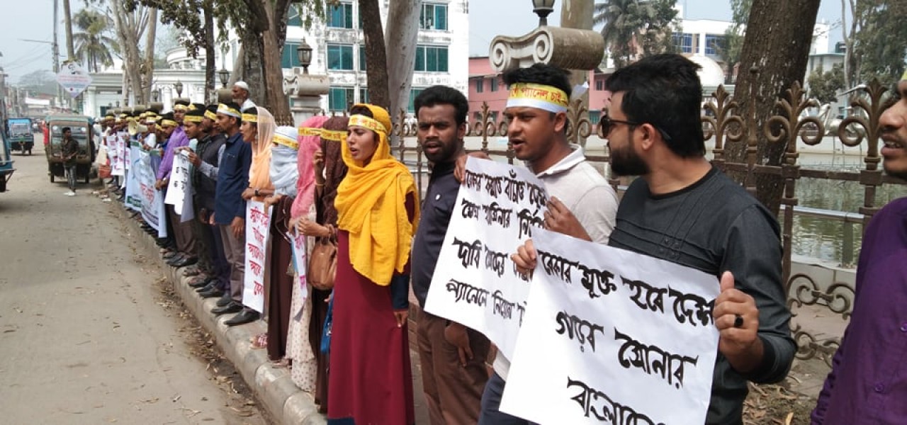 বাংলার কণ্ঠ প্রতিবেদক : “বঙ্গবন্ধুর স্বপ্নের দেশ-বেকার মুক্ত বাংলাদেশ-মাননীয় প্রধানমন্ত্রীর ঘোষণা মুজিব বর্ষে কেউ বেকার থাকবে না” এ শ্লোগানকে সামনে রেখে, ভোলায় প্রাথমিক সহকারী শিক্ষক নিয়োগের মৌখিক পরীক্ষায় অংশ গ্রহণকারী সাবাইকে প্যানেল গঠন করে নিয়োগের দাবিতে মানববন্ধন কর্মসূচী পালিত হয়েছে। সোমবার দুপুরে ভোলা প্রেস ক্লাবের সামেন এ কর্মসুচীর আয়োজন করে ‘প্রাথমিক সহকারী শিক্ষক নিয়োগ প্যানেল চাই’ কমিটি। এ সময় প্রাথমিক সহকারী শিক্ষক নিয়োগের মৌখিক পরীক্ষায় অংশ গ্রহণকারী সবাইকে প্যানেল গঠন করে নিয়োগের দাবি তুলে বক্তব্য রাখেন, মোঃ রাকিব হোসেন, ইমরান মামুন, মোঃ আলআমিন, আয়শা আক্তার নিহা, মোহাসিন ও নাজমুলসহ প্রাথমিক সহকারী শিক্ষক নিয়োগ প্যানেল চাই কমিটির অন্যান্য নেতারা। মানববন্ধন শেষে ভোলা জেলা প্রশাসক বরাবরে একটি স্মারকলীপি প্রদান করা হয়।