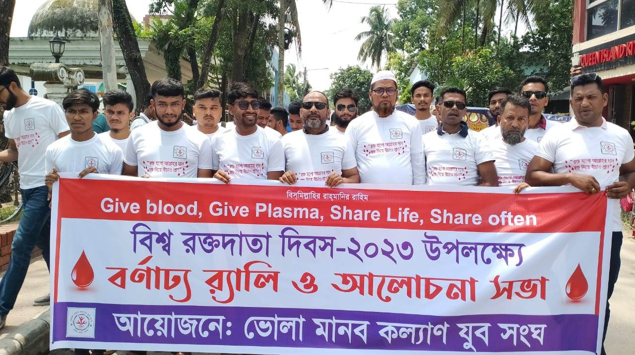 মোঃ ইসমাইল : এরাব নষড়ড়ফ, মরাব ঢ়ষধংসধ, ংযধৎব ষরভব, ংযধৎব ড়ভঃবহ এই প্রতিপাদ্য বিষয়কে সামনে রেখে ভোলায় বিশ্ব রক্তদাতা দিবস উপলক্ষে সচেতনতামূলক শোভাযাত্রা করছে সামাজিক সংগঠন ভোলা মানব কল্যাণ যুব সংঘ। বুধবার (১৪ জুন) সকাল ১০টা ভোলা প্রেসক্লাব প্রাঙ্গণ থেকে ভোলা মানব কল্যাণ যুব সংঘ ব্যানারে এই সচেতনতামূলক শোভাযাত্রা বের করা হয়।শোভাযাত্রাটি শহরের প্রধান প্রধান সড়ক প্রদক্ষিণ করে পুনরায় প্রেসক্লাব প্রাঙ্গণে গিয়ে শেষ হয়।