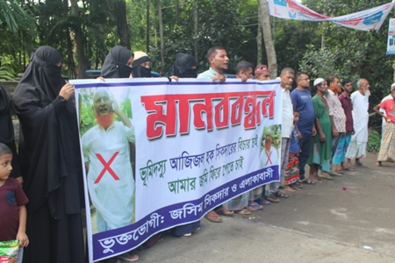 মানববন্ধনে বক্তব্য দেন মো. জসিম সিকদার, রফিকুল ইসলাম, তছির, রোজিনাসহ ভুক্তভোগী অনেকে।ভুক্তভোগী পরিবার জমি উদ্ধারের জন্য প্রশাসনসহ সবার সহযোগিতা কামনা করেন।