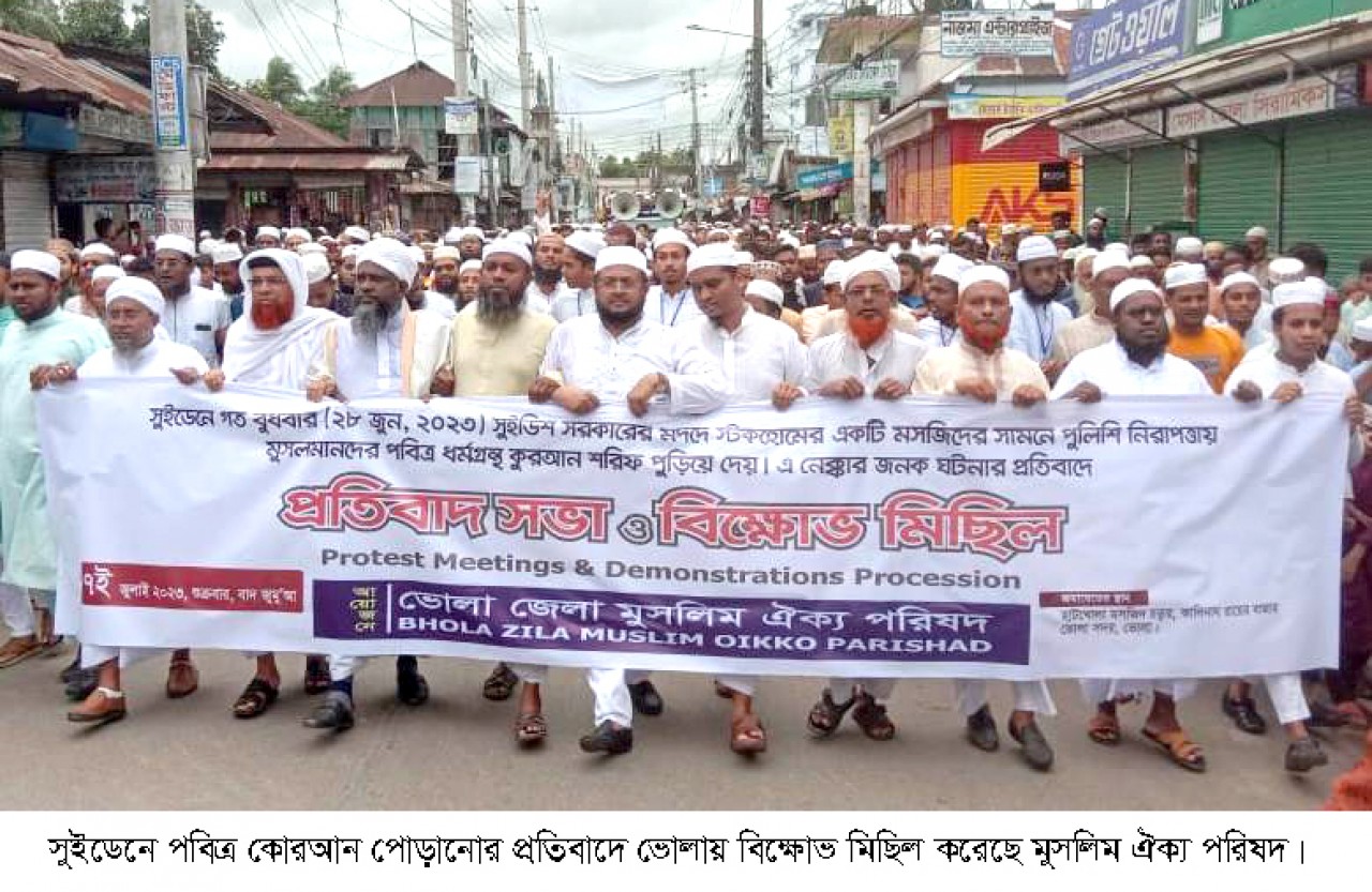বাংলার কণ্ঠ প্রতিবেদক :সুইডেনের স্টোকহোমের একটি মসজিদের সামনে মনবতার মুক্তির সনদ পবিত্র আল-কোরআন পোড়ানোর ঘটনায় ভোলায় প্রতিবাদ সভা ও বিক্ষোভ মিছিল করেছে ভোলা জেলা মুসলিম ঐক্য পরিষদ।