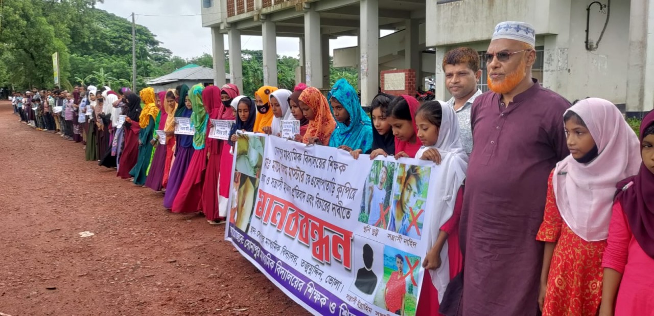 মানববন্ধনে অংশগ্রহণকারী প্রধান শিক্ষক মোঃ জাকির হোসেন স্বপন জানান,সহকারী শিক্ষক মোঃ মাহে আলমের উপর হামলাকারীদের সাথে জমিজমা বিরোধ নিয়ে আদালতে মামলা চলমান রয়েছে। গত ৬ জুলাই দুপুরে পরিকল্পিত ভাবে দা বটি লাঠিসোটা নিয়ে অভিযুক্ত মোঃ,ভুট্টো, ইব্রাহীম, নাহিদ, জিহাদ, পিয়ারা বেগমরা সন্ত্রাসী কায়দায় এলোপাতাড়ি বাড়িতে হামলা করে । এসময় মারপিট করে কুপিয়ে শিক্ষক মাহে আলমকে রক্তাক্ত জখম করে। তাকে প্রথমে তজুমদ্দিন হাসপাতালে পরে ভোলা সদর হাসপাতালে নেয়া হয়। এঘটনায় মামলা হলেও চিহ্নিত আসামিরা এখনো গ্রেফতার হয়নি। মানববন্ধনের মাধ্যমে আমরা এই ঘটনার তীব্র নিন্দা, প্রতিবাদ ও অপরাধীকে গ্রেফতার করে দ্রæত বিচারের আওতায় আনার দাবী জানান।
