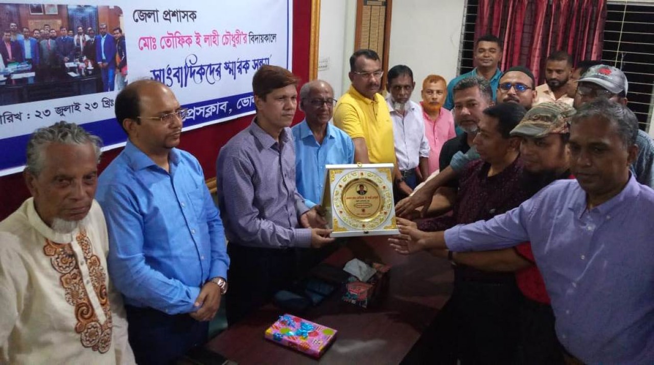 এ সময় বক্তারা, জেলা প্রশাসক মোঃ তৌফিক ই লাহী চৌধুরী'র ভোলায় দায়িত্ব পালনকালে তাঁর সাথে কাজ করার সময়ে বিশেষ মূহুর্তগুলো সাংবাদিকরা স্মৃতি চারন করেন সই সাথে তার আগামীর পথচলা যেন আরো মসৃণ ও সাফল্যমÐিত হয় এই কামনা করেন। পরে সাংবাদিকদের পক্ষ থেকে তার হাতে একটি শুভেচ্ছা স্মারক ও একটি বই উপহার তুলে দেয়া হয়। অনুষ্ঠানে বিদায়ী জেলা প্রশাসক মোঃ তৌফিক ই লাহী চৌধুরী বলেন,আমি যতদিন বেঁচে থাকবো ভোলাকে বুকে ধারন করে বেঁচে থাকবো। ভোলার উন্নয়েনে আমি নিজেকে সম সময় নিয়োজিত রেখেছি। ভোলার মানুষ আমাকে যথেষ্ট ভালোবাসা দিয়েছে।যে কোনো কাজে তারা আমাকে সার্বিক সহযোগিতা করে পাশে ছিলেন। এজন্য আমি সকলের প্রতি কৃতজ্ঞতা প্রকাশ করছি। এসময় তালহা তালুকদার বাঁধন এর সঞ্চালনায় অন্যান্যদের মধ্যে উপস্থিত ছিলেন,অতিরিক্ত জেলা প্রশাসক (সার্বিক)রিপন কুমার সাহা,পূজা উদযাপন পরিষদের গৌরাঙ্গ চন্দ্র দে, শিক্ষক বিপ্লব পাল প্রমুখ। সাংবাদিকদের মধ্যে উপস্থিত ছিলেন সময় টিভির প্রতিনিধি নাসির লিটন, ৭১ টেলিভিশন প্রতিনিধি কামরুল ইসলাম, গাজী টিভির প্রতিনিধি হেলাল উদ্দিন,মোহনা টেলিভিশন প্রতিনিধি জসিম রানা, একুশে টেলিভিশন প্রতিনিধি মেজবা উদ্দিন শিপু,ডিবিসি নিউজের অচিন্ত্য মজুমদার,বাসস এর প্রতিনিধি হাছনাইন আহমেদ মুন্না,বিটিভি প্রতিনিধি তৈয়বুর রহমান,মাই টিভি প্রতিনিধি আরিফ হোসেন লিটন,দীপ্ত টেলিভিশন প্রতিনিধি আবিদুল ইসলাম,যমুনা টিভির প্রতিনিধি জুয়েল সাহা,কালের কন্ঠের ইকরামুল আলম, সাংবাদিক মনিরুল ইসলাম, সাংবাদিক মনির সাজল,এখন টেলিভিশন প্রতিনিধি ইমতিয়াজ,স্বদেশ প্রতিদিন প্রতিনিধি এইচ আর সুমন,ঢাকা প্রতিদিন প্রতিনিধি মলয় দে সহ আরো অনেকে।