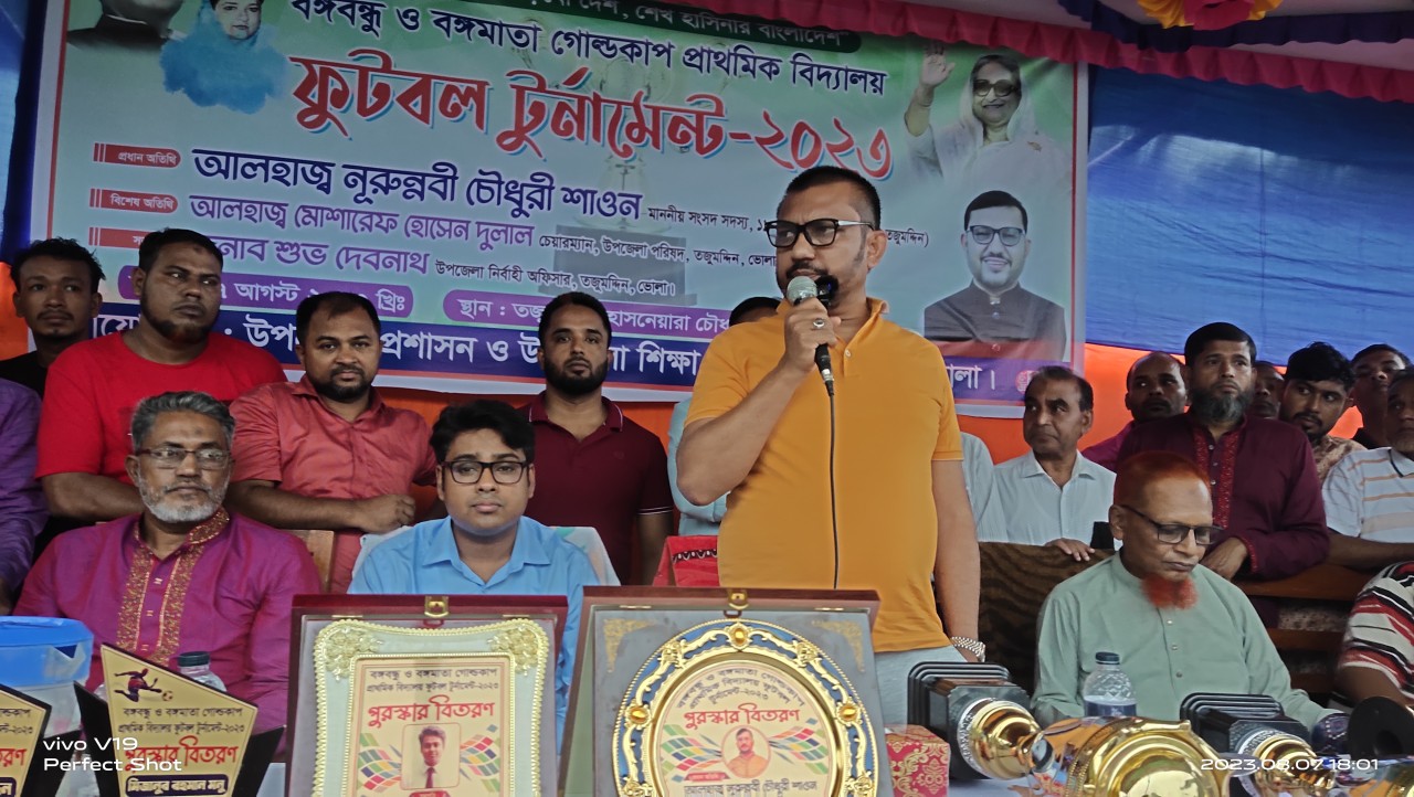 তজুমদ্দিন প্রতিনিধি: ভোলা তজুমদ্দিনে ৭ই আগস্ট তজুমদ্দিন উপজেলা পর্যায়ে দিন ব্যাপী বঙ্গবন্ধু ও বঙ্গমাতা বেগম ফজিলাতুন্নেছা মুজিব গোল্ডকাপ প্রাথমিক বিদ্যালয় ফুটবল টুর্নামেন্ট-২০২৩ উদ্বোধন করা হয়েছে। সকাল ১০টায় তজুমদ্দিন হোসনেয়ারা চৌধুরী মহিলা কলেজ মাঠে তজুমদ্দিন প্রশাসন ও তজুমদ্দিন উপজেলা শিক্ষা অফিস আয়োজনে উপজেলা নির্বাহী অফিসার শুভ দেবনাথ এর সভাপতিত্বে টুর্নামেন্টের উদ্বোধন এবং পরবর্তী বিকেল ৫টায় পুরুস্কার বিতরণ অনুষ্ঠানের প্রধান অতিথি হিসেবে উপস্থিত ছিলেন ভোলা-৩ এর সাংসদ আলহাজ্ব নুরুন্নবী চৌধুরী শাওন এমপি ।