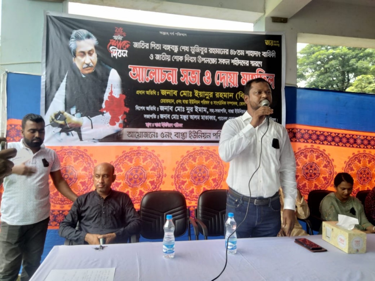তিনি বলেন, ১৯৭৫ সালের ১৫ আগস্ট কালরাতে ঘাতকের নির্মম বুলেটে হাজার বছরের শ্রেষ্ঠ বাঙালি জাতির পিতা বঙ্গবন্ধু শেখ মুজিবুর রহমান ও তাঁর পরিবারের সদস্যগণ শাহাদাত বরণ করেন। আজকে আমরা তাদের জন্য এ দোয়া মাহফিলের আয়োজন করেছি।এবং আমরা কালো ব্যাচ ধারণ করে স্বাধীনতার স্থপতিকে শ্রদ্ধা জানিচ্ছি। জাতির পিতার পলাতক খুনিদের দেশে ফিরিয়ে এনে শাস্তি কার্যকর করতে সরকার কাছে অনুরোধ থাকবে।