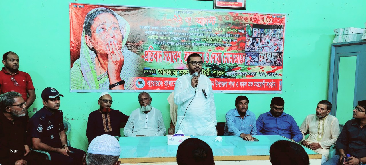 ২১ আগষ্ট সোমবার বিকাল ৫ টায় তজুমদ্দিন উপজেলা আওয়ামীলীগের সহসভাপতি মাষ্টার তৈয়বুর রহমানের সভাপতিত্বে আওয়ামী লীগ কার্যালয়ে আয়োজিত প্রতিবাদ সমাবেশ অনুষ্ঠানে প্রধান অতিথির বক্তব্যে তিনি এসব কথা বলেন।