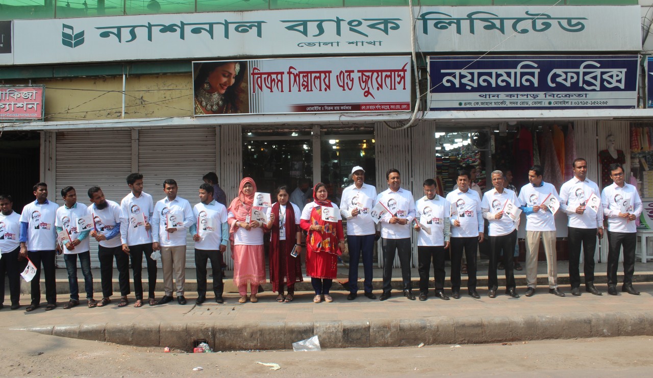 বাংলার কণ্ঠ প্রতিবেদক : বাংলাদেশ এসোসিয়েশন অব ব্যাংকস (বিএবি) এর নির্দেশনা অনুযায়ী মুজিব বর্ষ উদযাপন করেছে ন্যাশনাল ব্যাংক লিমিটেড ভোলা শাখা।আগামী এক বছর সমগ্র বাংলাদেশে উৎসব মুখর পরিবেশে উদযাপিত হবে ‘মুজিব বর্ষ। সারা বাংলাদেশ এর মত ন্যাশনাল ব্যাংক লিমিটেড ভোলা শাখা মুজিব শতবর্ষ উদযাপন করছে। বুধবার (১৮ মার্চ) ভোলা সদর রোড কে. জাহান মার্কেটের সামনে সকাল ১০ টা থেকে ১০.১০ মিনিট পর্যন্ত ব্যাংকের পরিচালক, নির্বাহী ও কর্মকর্তাবৃন্দ মুজিব বর্ষের লোগো সম্বলিত প্লাকার্ড নিয়ে বঙ্গবন্ধুকে সম্মান প্রদর্শনের জন্য অবস্থান করেন। অবস্থান কর্মসূচির পরবর্তীতে ন্যাশনাল ব্যাংক ভোলা শাখার ম্যানেজার আমিরুল ইসলাম সেকেন্ড অফিসার জাহাঙ্গীর হোসেন সহ ব্যাংকের সকল পর্যায়ের কর্মকর্তাবৃন্দ উপস্থিত থেকে কেক কেটে অনুষ্ঠান উদযাপন করেন।একই সময়ে সারা দেশব্যাপী ব্যাংকটির ২০৯টি শাখা এবং ১৪ টি উপ শাখায় একযোগে মানববন্ধন এবং কেক কেটে মুজিব শতবর্ষ উদযাপন করা হয়।