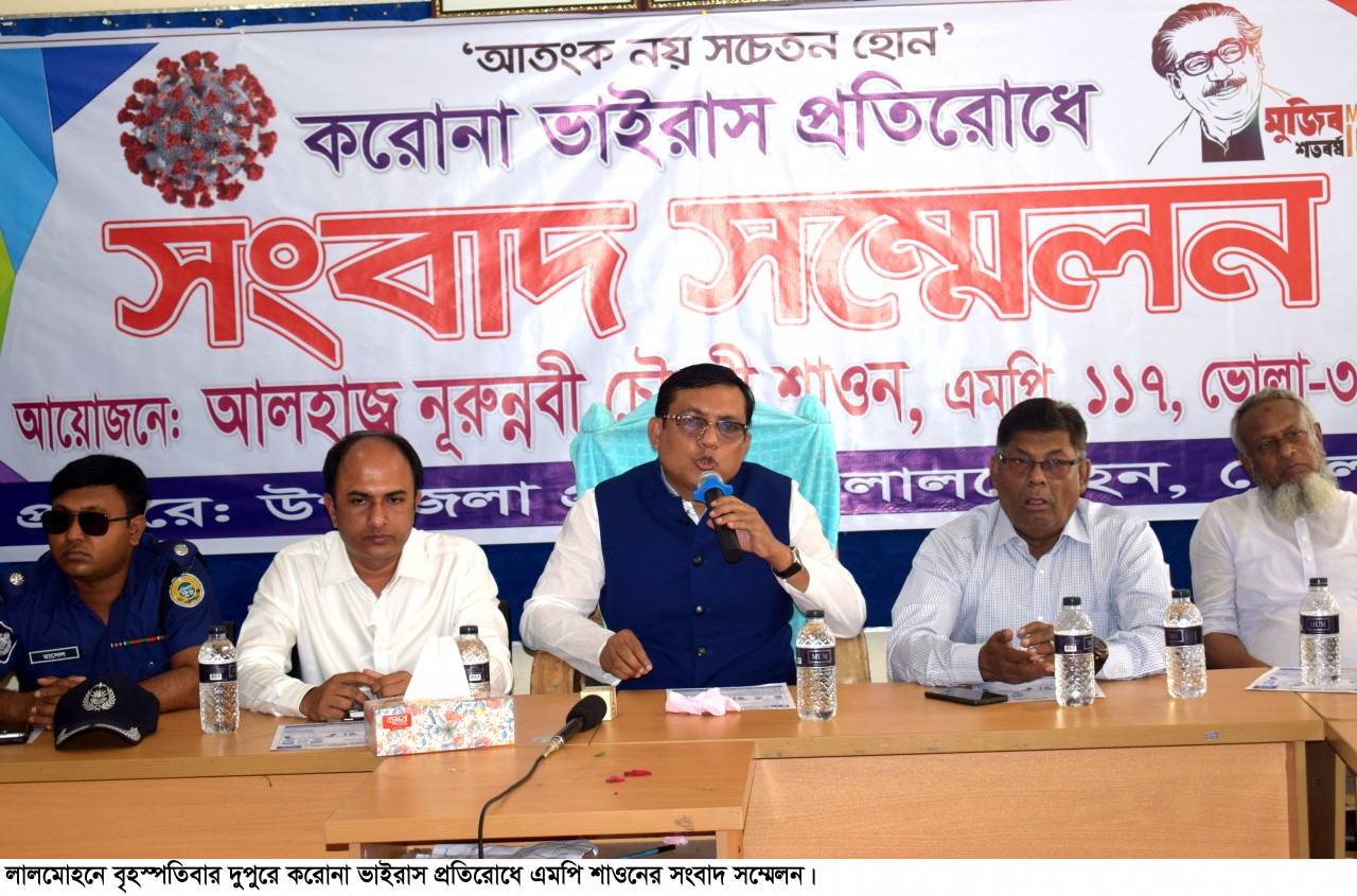 লালমোহন প্রতিনিধি : ভোলার লালমোহনে করোনা ভাইরাস প্রতিরোধে ৫ লক্ষ জনগনকে নিরাপদে রাখতে ভোলা-৩ আসনের এমপি নূরুন্নবী চৌধুরী শাওন জরুরী সংবাদ সম্মেলন করেছেন। বৃহস্পতিবার দুপুরে উপজেলা পরিষদ হলরুমে এ সংবাদ সম্মেলন করেন তিনি। এসময় এমপি শাওন লালমোহনে ১৬৪ জন বিদেশ ফেরত প্রবাসীকে তাদের নিজ বাড়িতে হোম কোয়ারেন্টাইনে থাকার আহবান জানিয়ে বলেন, উন্নত বিশ্বের চেয়ে আধুনিক চিকিৎসা সেবায় আমরা পিছিয়ে রয়েছি। তবুও সরকার করোনা ভাইরাস মোকাবেলায় সচেষ্ট রয়েছে। এতে আতঙ্কিত না হয়ে সকলকে সর্তকতা মেনে চলার অনুরোধ করেন তিনি।