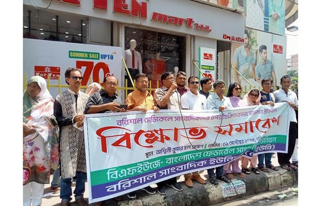 বরিশাল নগরীর সদর রোডে আজ বেলা সাড়ে ১১টা এই বিক্ষোভ সমাবেশ অনুষ্ঠিত হয়। বাংলাদেশ ফেডারেল সাংবাদিক ইউনিয়নের (বিএফইউজে) অধিভূক্ত বরিশাল সাংবাদিক ইউনিয়নের উদ্যোগে বিক্ষোভ হয়।