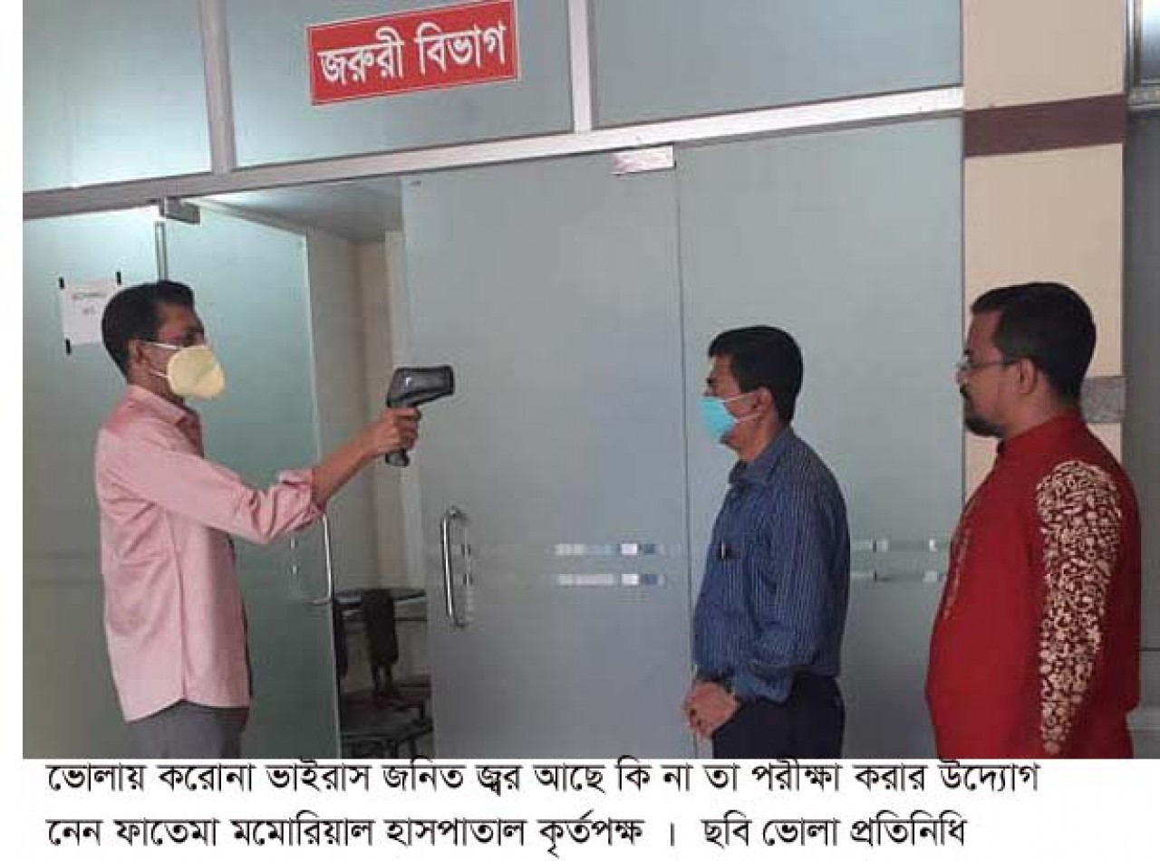 বাংলার কণ্ঠ প্রতিবেদক : ভোলায় করোনাভাইরাস জনিত জ্বর আছে কিনা তা ডিজিটাল কীটস এর মাধ্যমে পরীক্ষা করার উদ্যোগ নিয়েছে বে-সরকারি ফাতেমা মেমোরিয়াল হাসপাতাল কর্তৃপক্ষ। সোমবার পরীক্ষামূলক এটি চালু করা হয়। এ সময় উপস্থিত ছিলেন, ফাতেমা মমোরিয়াল হাসপাতালের চেয়ারম্যান সাবেক সিভিল সার্জন ডাঃ ফরিদ আহম্মেদ, প্রেসক্লাব সম্পাদক অমিতাভ অপু, সহকারী অধ্যাপক হোসেন আহম্মেদ, ফাতেমা মেমোরিয়ালের ম্যানেজার শিল্পী বেগম, তত্ববধায়ক মোঃ হানিফ । তবে হাসপাতাল কৃর্তপক্ষ জানান, এটি দ্বারা কেবল দুর থেকে স্পর্শ না করে শরীরের জ¦র বা তাপমাত্রা সনাক্ত করা সম্ভব। ভোলা পৌরসভা কার্যালয়ে এমন ব্যবস্থার আয়োজন করেছেন পৌর মেয়র মোহাম্মদ মনিরুজ্জামান।