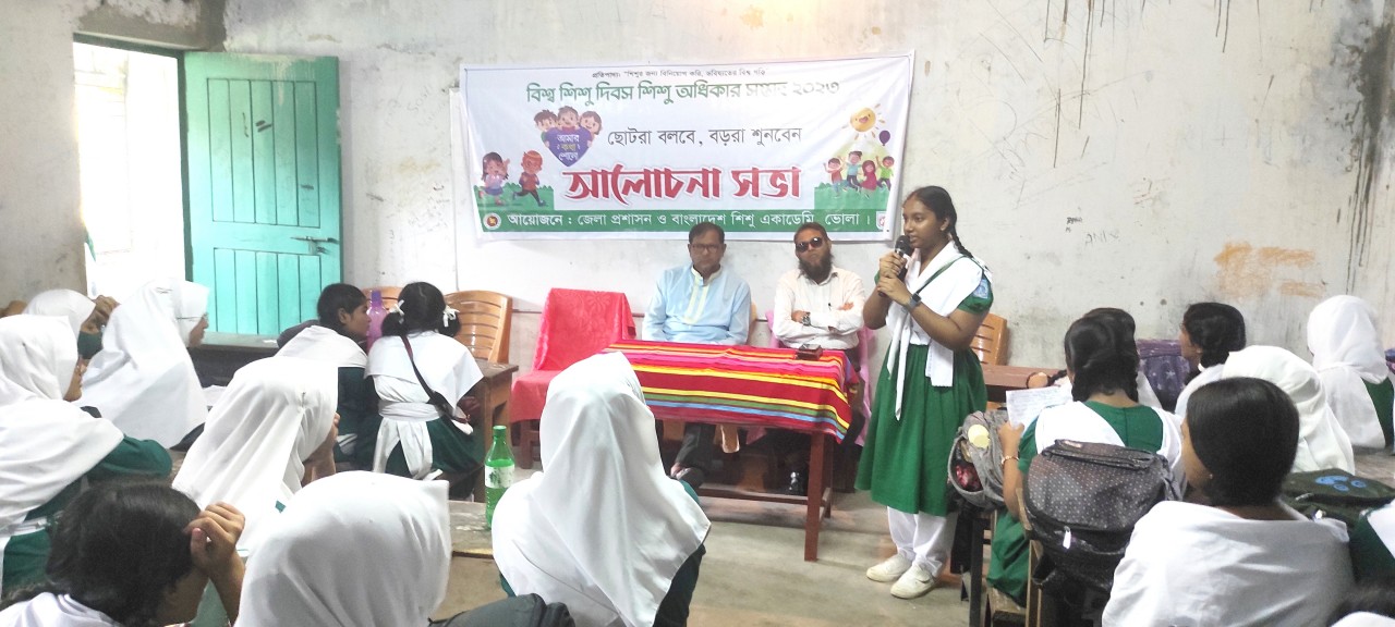 বাংলার কণ্ঠ প্রতিবেদক : ভোলায় আমার কথা শোন (ছোটরা বলবে, বড়রা শুনবে) আমার দৃষ্টিতে স্মার্ট বাংলাদেশ শীর্ষক আলোচনা সভা অনুষ্ঠিত হয়েছে। মঙ্গলবার (৩ অক্টোবর) সকালে বিশ্ব শিশু দিবস ও শিশু অধিকার সপ্তাহ ২০২৩ এর সপ্তাহব্যাপী আয়োজনের অংশ হিসাবে ভোলা সরকরি বালিকা উচ্চ বিদ্যালয়ে জেলা প্রশাসন ও বাংলাদেশ শিশু একাডেমি ভোলার যৌথ আয়োজনে এ আলোচনা সভা অনুষ্ঠিত হয়। আলোচনা সভায় শিশুরা ”আমার দৃষ্টিতে স্মার্ট বাংলাদেশ” বিষয়ে নিজেদের মতামত ও তাদের প্রত্যাশিত স্মার্ট বাংলাদেশ সম্পর্কে মতামত ব্যক্ত করেন।