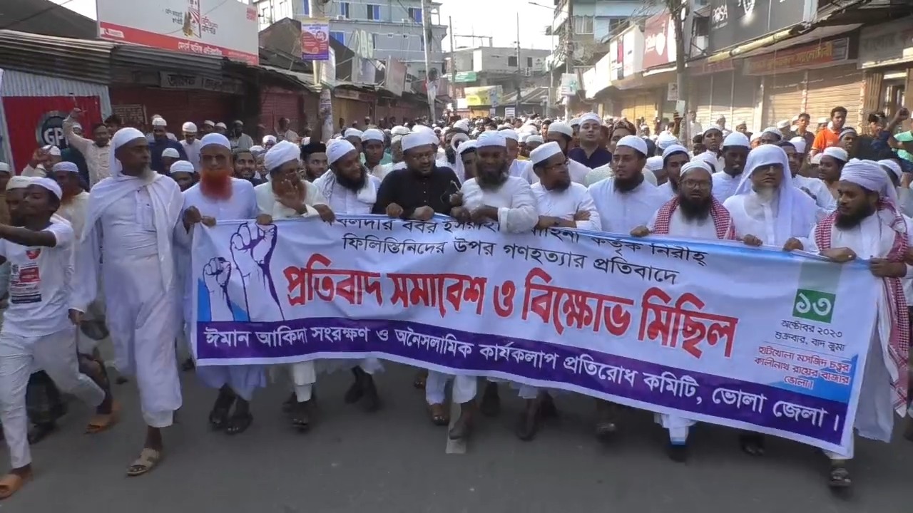 বাংলার কণ্ঠ প্রতিবেদক : দখলদার বর্বর ইসরাইলি বাহিনী কর্তৃক নিরীহ ফিলিস্তিনিদের উপর গনহত্যার প্রতিবাদে ভোলায় প্রতিবাদ সমাবেশ ও বিক্ষোভ মিছিল অনুষ্ঠিত হয়েছে। শুক্রবার বাদ জু'মা ভোলা হাটখোলা জামে মসজিদের সামনে ভোলা জেলা ঈমান আকিদা সংরক্ষণ ও অনৈসলামিক কার্যকলাপ প্রতিরোধ কমিটির আয়োজনে প্রতিবাদ সমাবেশ ও বিক্ষোভ মিছিল অনুষ্ঠিত হয়।