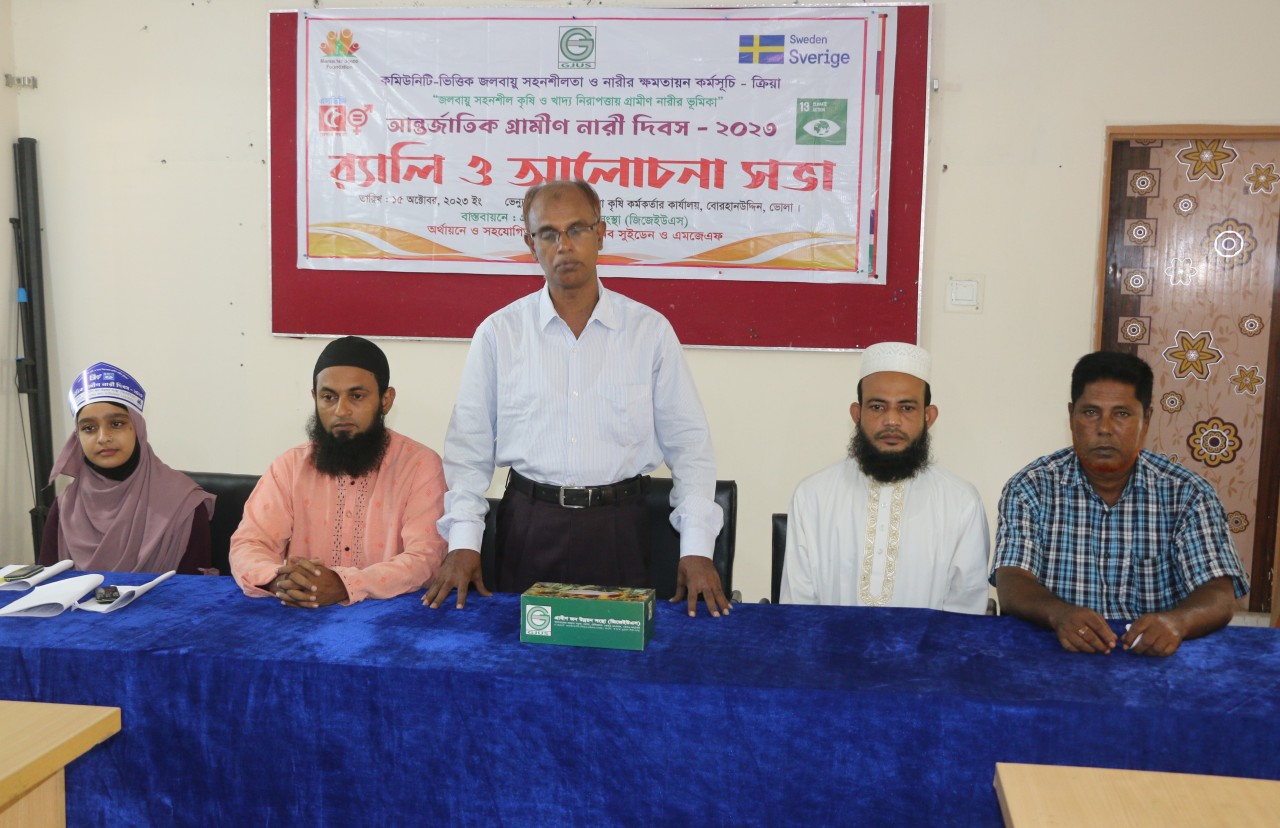 মানুষের জন্য ফাউন্ডেশনের ক্রিয়া প্রকল্পের আওতায় গ্রামীন জন উন্নয়ন সংস্থা আজ সকালে বোরহানউদ্দিন উপজেলা কৃষি অফিসের হলরুমে দিবসটির আয়োজন করে। দিবসটির এবারের বিষয় ছিলো জলবায়ু সহনশীল কৃষি ও খাদ্য নিরাপত্তায় গ্রামীন নারীর ভুমিকা। অনুষ্ঠানে প্রধান অতিথি ছিলেন উপজেলা যুব উন্নয়ন কর্মকর্তা মোঃ মিজানুর রহমান। গ্রামীন জন উন্নয়ন সংস্থার সহকারি পরিচালক আনিসুর রহমান টিপুর সভাপতিত্বে বক্তব্য রাখেন উপজেলা প্রানী সম্পদ কর্মকর্তা উপজেলা প্রানী সম্পদ কর্মকর্তা ডাঃ আসাদুজ্জামান, সাচরা ইউনিয়নের প্যানেল চেয়ারম্যান মোঃ শেলিম সিকদার, চর গঙ্গাপুর দাখিল মাদ্রাসার সুপার মোঃ মিজানুর রহমান, প্রকল্প ফ্যাসিলিটিটর সামিরা মৌ।