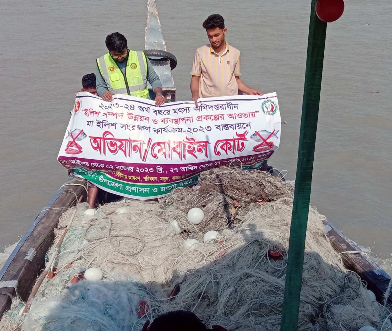 সুত্রে জানা যায়, তজুমদ্দিন উপজেলা মৎস্য অফিসের মেরিন ফিশারিজ কর্মকর্তা আল আমিনের নেতৃত্বে মৎস্য অফিসের একটি অভিযানিক দল মা ইলিশ রক্ষার অভিযান চালনা করেন। সোমবার (৩০ অক্টোবর) রাতভর বাসনভাঙ্গার চর, চরমোজাম্মেল, কাঞ্চনপুরচর সংলগ্ন মেঘনার বিভিন্ন এলাকায় অভিযান পরিচালনা করেন। এ সময় মা ইলিশ শিকারের জন্য নদীতে বসানো অবস্থায় ২০হাজার মিটার সুতা ও কারেন্ট জাল আটক করেন। জেলেরা দৌড়ে গহীন জঙ্গলে পালিয়ে যাওয়ায় আটক করতে পারেননি বলে জানান অভিযানে নেতৃত্বদানকারী মেরিন ফিশারিজ কর্মকর্তা। পরে আটক জাল বিকাল বেলায় শশীগঞ্জ সুইজঘাট এলাকায় এনে অগুনে পুড়ে ধ্বংস করা হয়।