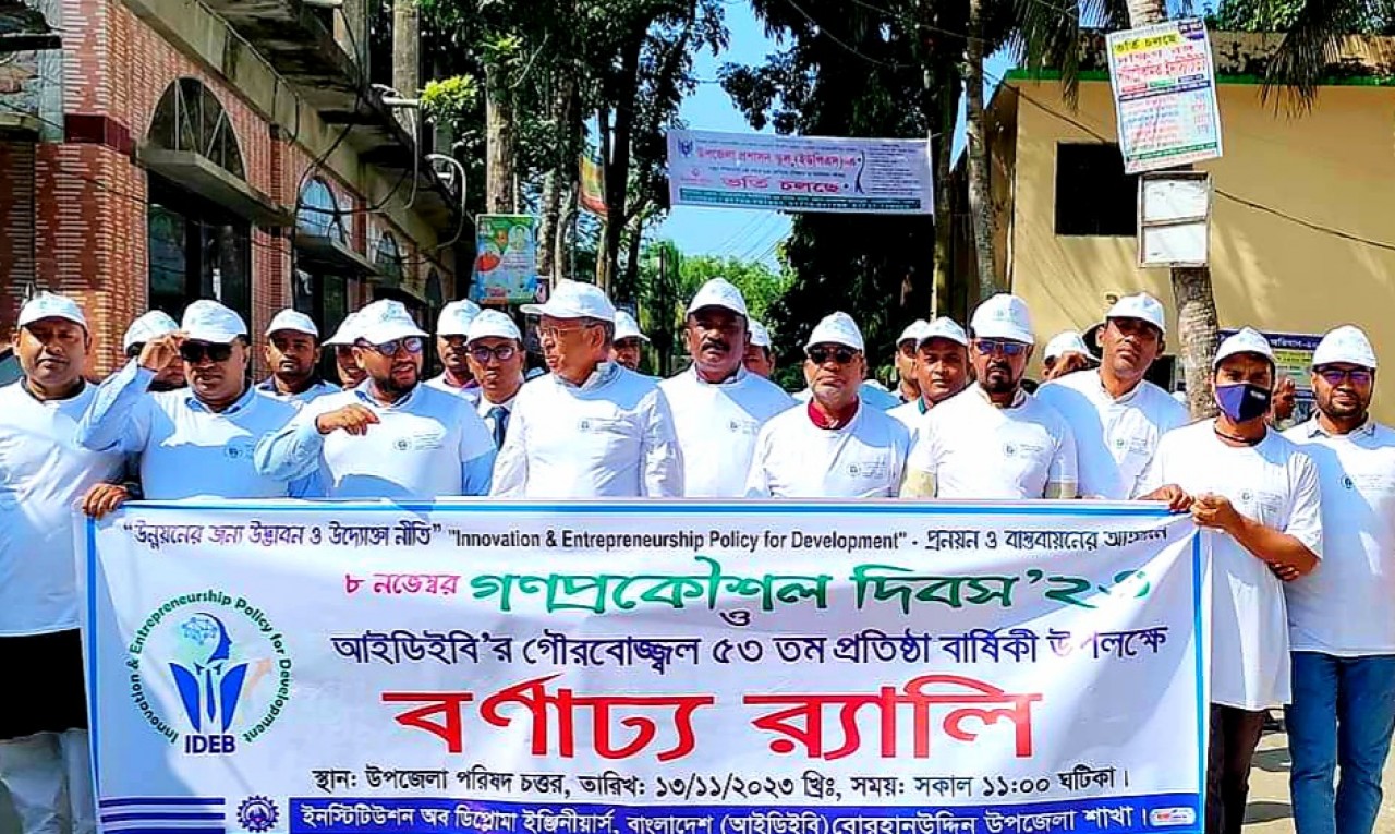 সোমবার সকালে উপজেলা পরিষদের সামনে থেকে একটি বর্ণাঢ্য শোভাযাত্রা উপজেলা পরিষদের সামনে থেকে শুরু হয়ে পৌর শহরের গুরুত্বপূর্ণ সড়কসমূহ প্রদিক্ষণ করে একই স্থানে এসে শেষ হয়। শোভাযাত্রা শেষে উপজেলা পরিষদ চত্বরের সামনে আইডিইবি’র বোরহানউদ্দিন উপজেলা ইউনিটের সভাপতি আবাসিক প্রকৌশলী ফিরোজ হোসেন সন্যামতের সভাপতিত্বে বক্তৃতা করেন উপজেলা চেয়ারম্যান আবুল কালাম আজাদ,উপজেলা নির্বাহী কর্মকর্তা রায়হান-উজ্জামান,ভাইস চেয়ারম্যান রাসেল আহমেদ,বিআরডিবি চেয়ারম্যান জসিমউদ্দিন, টবগী ইউনিয়ন চেয়ারম্যান জসিমউদ্দিন হাওলাদার,বোরহানউদ্দিন আইডিইবি’র সাধারণ স¤পাদক জনস্বাস্থ্য প্রকৌশলী মাহফুজুর রহমান,সাংগঠিনক স¤পাদক পৌরসভার উপ-সহকারী প্রকৌশলী মো. আকবর হোসেন রিফাত প্রমুখ। এসময় বিভিন্ন দপ্তরের ডিপ্লোমা প্রকৌশলীগণ উপস্থিত ছিলেন।