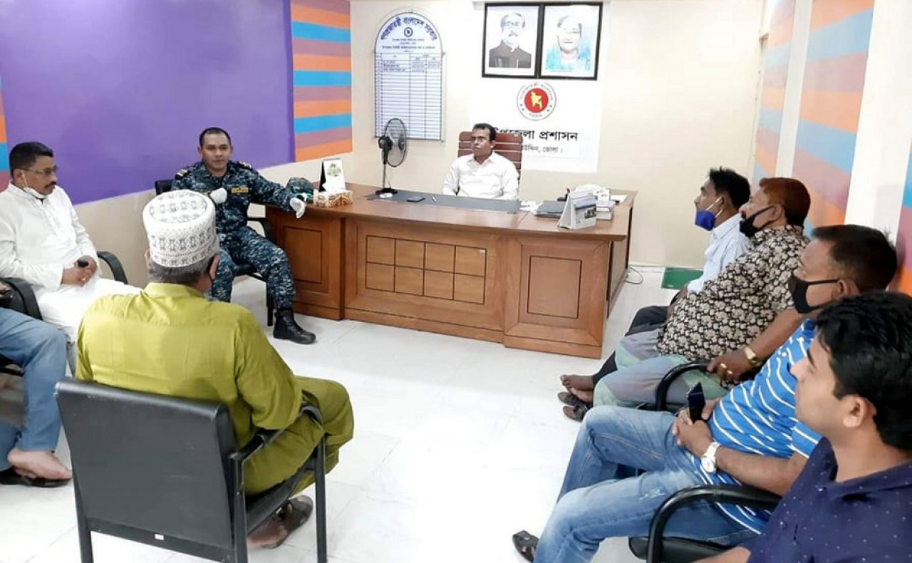 বোরহানউদ্দিন প্রতিনিধি:: ভোলার বোরহানউদ্দিনে বর্তমান করোনা পরিস্থিতিতে সামাজিক দূরত্ব বজায় রাখতে প্রশাসন, নৌবাহিনী ও জনপ্রতিনিধিদের করণীয় শীর্ষক মতবিনিময় সভা অনুষ্ঠিত হয়। বৃহস্পতিবার সকালে বোরহানউদ্দিন উপজেলা নির্বাহী অফিসারের কার্যালয়ে ওই সভা অনুষ্ঠিত হয়। উপজেলা নির্বাহী অফিসার(ভারপ্রাপ্ত) মো. বশির গাজীর সভাপতিত্বে ওই সভায় জনসমাগম ও সামাজিক দূরত্ব বজায় রাখতে সামরিক বাহিনীর কঠোর অবস্থানের কথা উল্লেখ করে বক্তব্য রাখেন ভোলার নৌ-কন্টিনজেন্টের কমান্ডার লেফটেন্যান্ট কমান্ডার নুর মোহাম্মদ। ওই সময় তিনি স্থানীয় চেয়ারম্যান সহ সকল জনপ্রতিনিধিদের তাদের স্ব-স্ব এলাকায় সামাজিক দূরত্ব বজায় রাখা সহ জরুরী প্রয়োজন ছাড়া যাতে কেউ ঘর থেকে বের না হন তা নিশ্চিত করতে জোড়ালো ভূমিকা রাখার আহবান জানান। সভায় উপজেলার সকল ইউনিয়নের চেয়ারম্যানবৃন্দ উপস্থিত ছিলেন।
