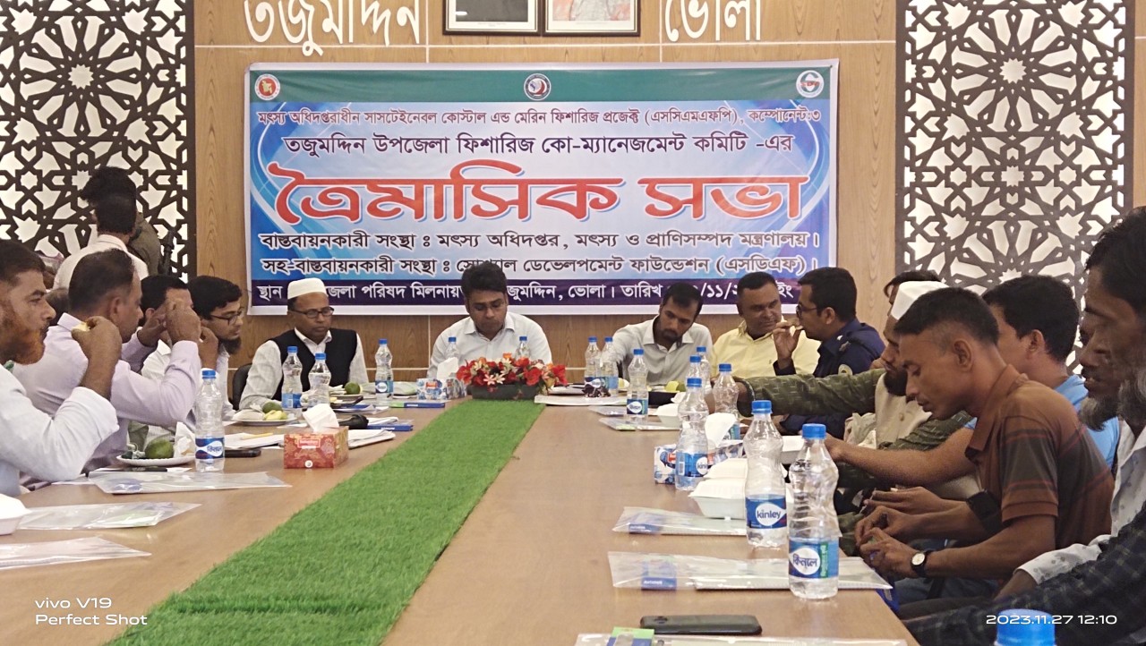 সোমবার ২৭ নবেম্বর সকাল ১১টায় তজুমদ্দিন উপজেলা সম্মেলন কক্ষে মৎস্য ও প্রানিসম্পদ মন্ত্রণালয়ের বাস্তবায়নে, সোশ্যাল ডেভেলপমেন্ট ফাউন্ডেশন (এসডিএফ) সহ-বাস্তবায়নে, তজুমদ্দিন এসডিএফ এর ক্লাস্টার অফিসার এম এ কাদের এর সঞ্চালনায় উপজেলা নির্বাহী অফিসার শুভ দেবনাথ এর সভাপতিত্বে এসময় আরও উপস্থিত ছিলেন, চাঁদপুর ইউপি চেয়ারম্যান একেএম শহিদুল্লাহ কিরন, মৎস্য কর্মকর্তা আমির হোসেন, ফিশারিজ কর্মকর্তা আলআমিন সহ বিভিন্ন গ্রাম সমিতির সভাপতি সম্পাদক সহ অন্যন্যরা।