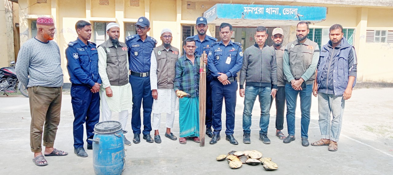 মনপুরা থানার ওসি মোঃ জহিরুল ইসলাম জানান, উপজেলার হাজিরহাটের বাঁধের হাট এলাকায় পুলিশি চেকপোস্টে তল্লাশীর সময় ১৪ টি কচ্ছপসহ এক ব্যাক্তি আটক করা হয়। পরে উদ্ধারকৃত ১৪ টি কচ্ছপ বনবিভাগের কাছে হস্তান্তর করা হয়। আটককৃত ব্যক্তি ভ্রাম্যমান আদালতের মাধ্যমে ৬ হাজার টাকা জরিমানা করে ছেড়ে দেন ভ্রাম্যমান আদালতের বিচারক।