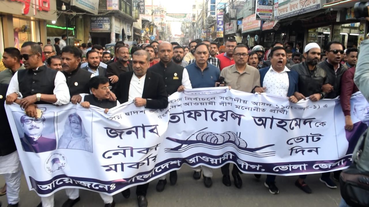 বাংলার কণ্ঠ প্রতিবেদক: ভোলায় প্রচার প্রচারনার শেষ দিনে বৃহষ্পতিবার সন্ধ্যার আগে আওয়ামীলীগের নৌকার প্রার্থী বর্ষীয়ান রাজনীতিবিদ তোফায়েল আহমদের নির্বাচনী শেষ প্রচারনায় শহরের হাজার হাজার নারী পুরুষের ঢল নামে। এসময় বাদ্য বাজিয়ে উৎসবের নগরীতে পরিনত হয়। এসময় শহরে নৌকার গনজোয়ার ওঠে। বিকালে ভোলা বাংলা স্কুল মোড় থেকে তোফায়েল আহমদের নেতৃত্বে বিশাল প্রচারনা পুরো শহর প্রদক্ষিন করে কয়েক হাজার নেতাকর্মী। পরে জেলা আওয়ামীলীগ কার্যালয়ের সামনে বক্তৃতায় আওয়ামীলীগের উপদেষ্টা পরিষদের সদস্য সাবেক মন্ত্রী ও ভোলা-১ আসনের আওয়ামী লীগের প্রার্থী তোফায়েল আহমেদ বলেন, বিএনপি একটি সন্ত্রাসী দল , এই দল এখন শেষ হওয়ার পথে, এই দলটা শেষ হয়ে যাবে। কারন এরা সন্ত্রাসী, তাদের কোন নেতা নাই। কোথায় সাজাপ্রাপ্ত একজন লন্ডনে বসে নেতৃত্ব দেয় । লন্ডনে বসে কি নেতৃত্ব হয় ? আপনারা বিএনপির কথা ভুলে যান। এটা সন্ত্রাসী দল ,মানুষ এটাকে পছন্দ করে না। বিএনপি প্রচার করছে মানুষ ভোট দিবে না। কিন্তুু মানুষ লাইন দিয়ে ভোট দিবে এত ভোট দিবে তারা জীবনেও ভাবেনি। এই সন্ত্রাসী দলের হাত থেকে আমরা বাংলাদেশকে রক্ষা করব। তিনি আরো বলেন, প্রধানমন্ত্রী শেখ হাসিনার নেতৃত্বে বাংলাদেশ এগিয়ে চলেছে । এতো উন্নয়ন প্রধানমন্ত্রী করেছেন বাংলাদেশের জন্য তা কখনো কেউ স্বপ্নও ভাবেনি।