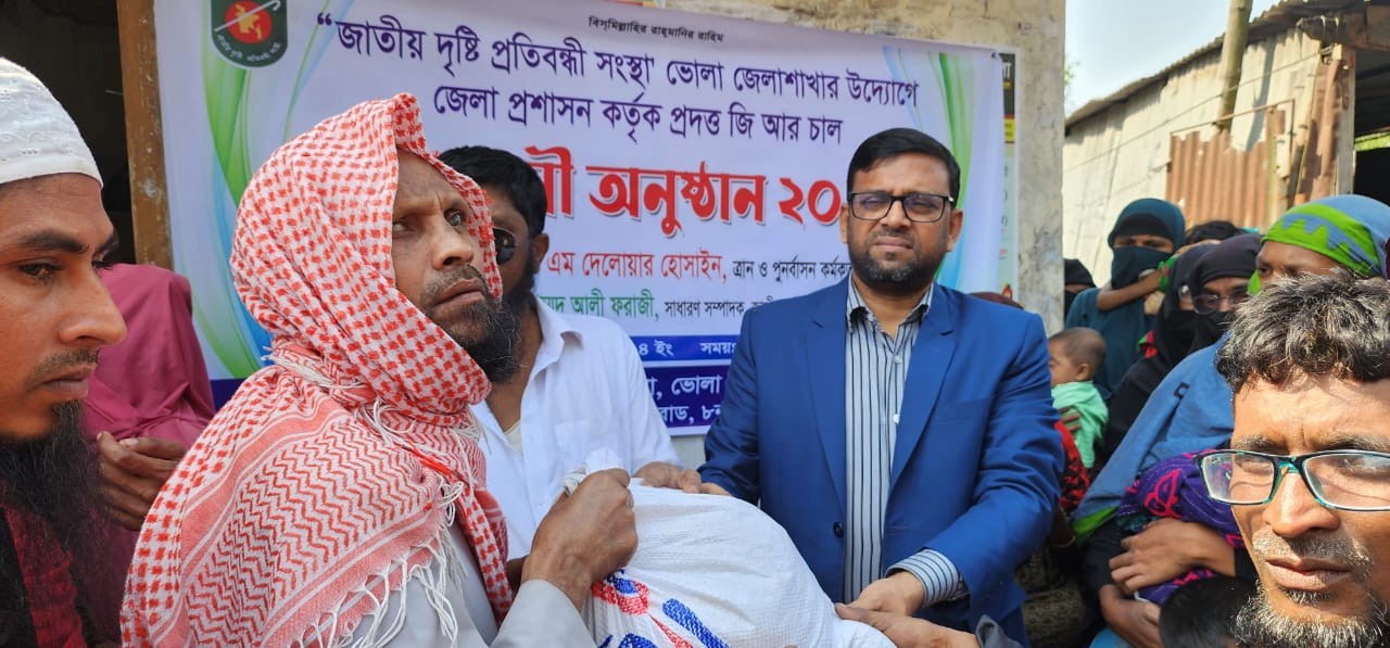 ভোলায় অসহায় ও দুস্থ দৃষ্টি প্রতিবন্ধীদের মাঝে চাল বিতরণ করা হয়েছে। আজ বৃহস্পতিবার দুপুরে ভোলার শহরের পৌর কাঠালি এলাকায় জাতীয় দৃষ্টি প্রতিবন্ধী সংস্থার ভোলা জেলা অফিস কার্যালয়ের চত্ত¡ারে এ চাল বিতরণ করা হয়। জাতীয় দৃষ্টি প্রতিবন্ধী সংস্থা ভোলার উদ্যোগে ও জেলা প্রশাসক কর্তৃক জি আর চাল বিতরণ অনুষ্ঠানে প্রধান অতিথি ছিলেন জেলা ত্রান ও পূনর্বাসন কর্মকর্তা এস.এম দেলোয়ার হোসাইন।