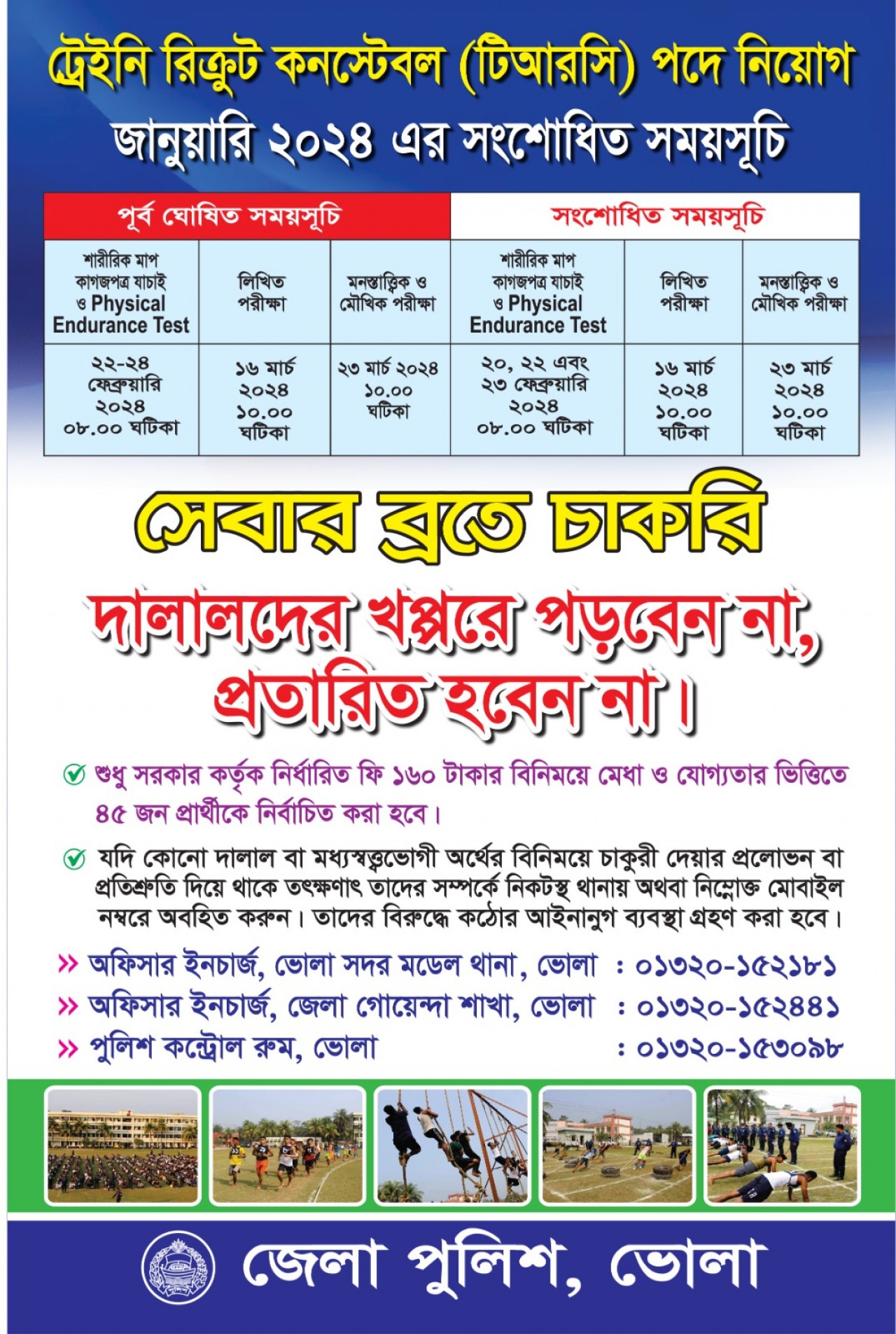 মলয় দে : ভোলায় বাংলাদেশ পুলিশের ট্রেইনি রিক্রুট কনস্টেবল (টিআরসি) পদে নিয়োগের সংশোধিত সময়সূচি প্রকাশ করেছে ভোলা জেলা পুলিশ। বুধবার ভোলা ডিস্ট্রিক্ট পুলিশ এর ফেইসবুক পেজ থেকে এ সংশোধিত সময়সূচি নিয়ে পোস্ট করা হয়। ওই পোস্টে ২২,২৩ ও ২৪ ফেব্রুয়ারি শারীরিক মাপ ও কাগজপত্র যাচাই করার কথা থাকলেও পরবর্তীতে সংশোধিত তারিখ হিসেবে ২০,২২ ও ২৩ ফেব্রুয়ারি ২০২৪ সকাল ৮ টায় অনুষ্ঠিত হবে বলে উল্লেখ রয়েছে।
