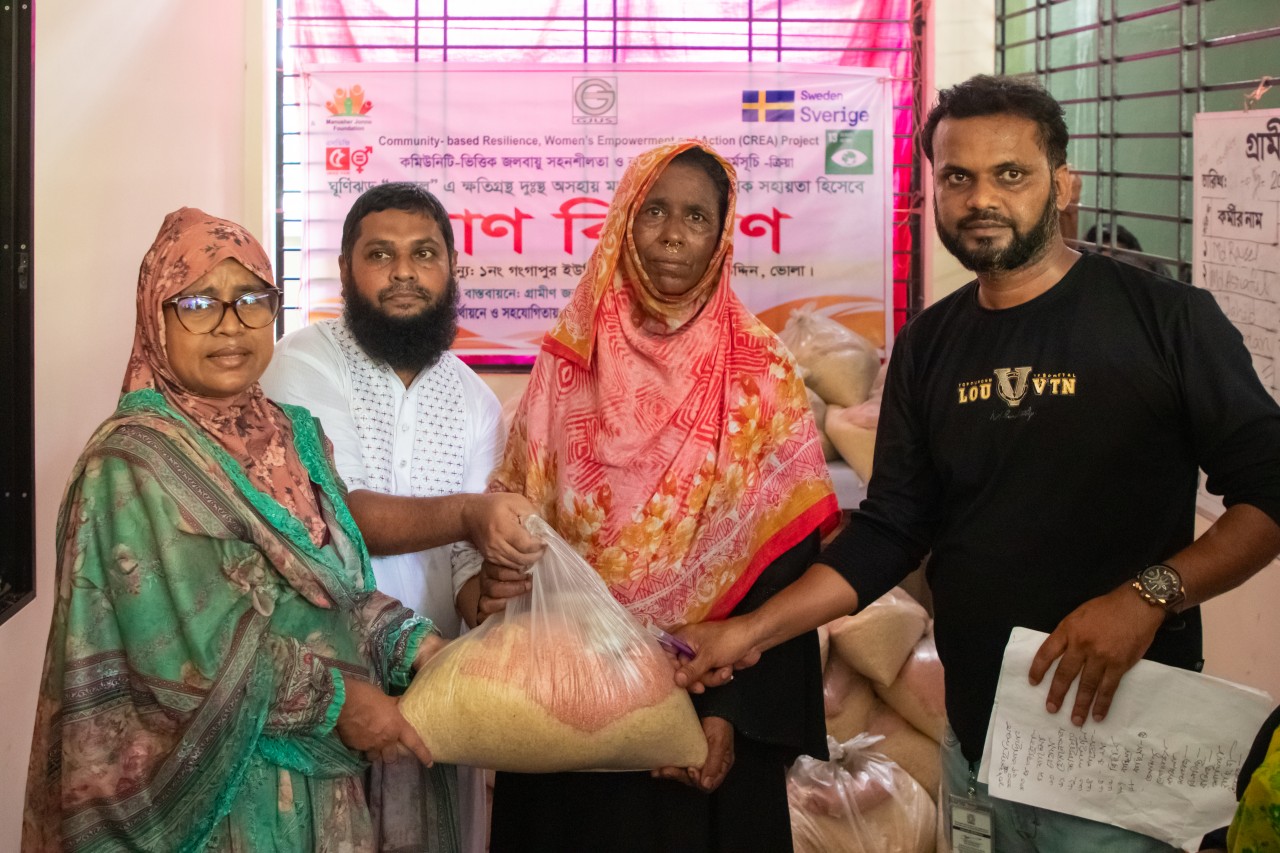 সুইডেন সরকারের অর্থায়নে, মানুষের জন্য ফাউন্ডেশনে (এমজেএফ) সহযোগিতায় “কমিউনিটি ভিত্তিক জলবায়ু সহনশীলতা ও নারীর ক্ষমতায়ন কর্মসূচি-ক্রিয়া” প্রল্পের আওতায় গ্রামীণ জন উন্নয়ন সংস্থা জিজেইউএস) খাদ্যগুলো বিতরণ করে। বিতরণ অনুষ্ঠানের প্রধান অতিথি ছিলেন গ্রামীন জন উন্নয়ন সংস্থার পরিচালক কমৃসুচি এন্ড লিগ্যল অ্যাডভোকেট বীথি ইসলাম। উপস্থিত ছিলেন গঙ্গাপুর ইউনিয়ন পরিষদ সদস্য নীলা আলম, আফসুরা বেগম, প্রকল্প সমন্বয়কারী বাবুল আখতার, মোঃ আব্দুল জব্বার, প্রকল্প সমন্বযকারী, সমৃদ্ধি, আবুল হাসান, শাখা ইনচার্জ গংগাপুর, ক্রিয়া প্রকল্পের প্রকল্প কর্মকর্তা ইরিন ইসরাত, ফিল্ড ফ্যাসিলিটেটর সামিয়ামৌ, অ্যাডমিন ও অ্যাকাউন্টস অফিসার মোঃ জাফর উল্লাহ, ফিল্ড ফ্যাসিলিটেটর ইকবাল হোসেন অভি প্রমুখ। ত্রানের মধ্যে ছিলো প্রতিটি প্যাকেটে ৭ কেজি চাল ও ৩ কেজি করে মশুরডাল । এ ছাড়াও আশ্রয়কেন্দ্রে আসা বানভাসিদের শুকনো খাবার বিতরণ করা হয়।