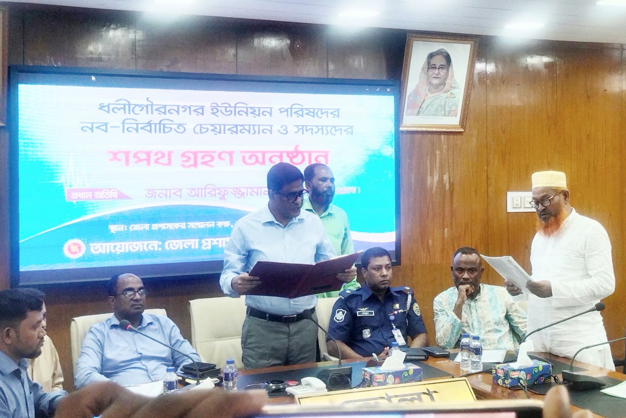 লালমোহন প্রতিনিধি : ভোলার লালমোহন উপজেলার ধলীগৌরনগর ইউনিয়ন পরিষদের নবনির্বাচিত চেয়ারম্যান ও সদস্যরা শপথ গ্রহণ করেছেন। সোমবার দুপুরে ভোলা জেলা প্রশাসকের সম্মেলন কক্ষে তাদের শপথবাক্য পাঠ করানো হয়। ধলীগৌরনগর ইউপি চেয়ারম্যান মাকসুদুর রহমান হাওলাদারকে শপথবাক্য পাঠ করান জেলা প্রশাসক আরিফুজ্জামান।