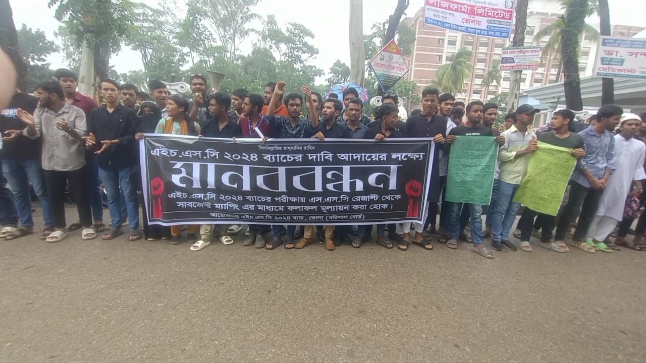 শনিবার সকাল ১১ টার দিকে বৃষ্টি উপেক্ষা করে ভোলা প্রেসক্লাবের সামনে এ মানববন্ধন কর্মসূচি পালন করে শিক্ষার্থীরা। ভোলা সরকারি সরকারি কলেজ, সরকারি শেখ ফজিলাতুন্নেছা মহিলা কলেজ, নাজিউর রহমান ডিগ্রি কলেজসহ এ জেলার বিভিন্ন কলেজের শিক্ষার্থীরা বিক্ষোভ মিছিল ও মানববন্ধনে অংশ গ্রহণ করে। এসময় তারা নানা স্লোগান দিতে থাকেন। মানববন্ধনে অংশ নেয়া শিক্ষার্থীরা তাদের দাবী তুলে ধরে জানান,সকল শিক্ষার্থীদের এসএসসি ও সমমানের পরীক্ষার ফলাফলের ভিত্তিতে সাবজেক্ট ম্যাপিং তথা বিষয় সমন্বয়ের মাধ্যমে এইচএসসি ও সমমানের পরীক্ষার ফলাফল ঘোষণা করতে হবে। এক্ষেত্রে অনুষ্ঠিত সকল এইচএসসি ও সমমানের পরীক্ষা বাতিল বলে গণ্য করতে হবে এবং মাধ্যমিক ও উচ্চ মাধ্যমিক শিক্ষাবোর্ড, ঢাকা এবং আন্তঃশিক্ষা বোর্ড সমন্বয় কমিটির চেয়ারম্যান অধ্যাপক তপন কুমার সরকার সহ আন্তঃশিক্ষা বোর্ড সমন্বয় কমিটির সকল সদস্যদের অনতিবিলম্বে পদত্যাগ করার জন্য দাবী জানান। এ ছাড়াও আন্ত:শিক্ষা বোর্ড সমন্বয় কমিটি কর্তৃক প্রণিত রুটিন, যা ১৫ই আগস্ট, ২০২৪ ইং প্রকাশিত হয়, তা সর্বস্তরের শিক্ষার্থীরা প্রত্যাখ্যান করা হয়েছে বলে জানান তারা।
