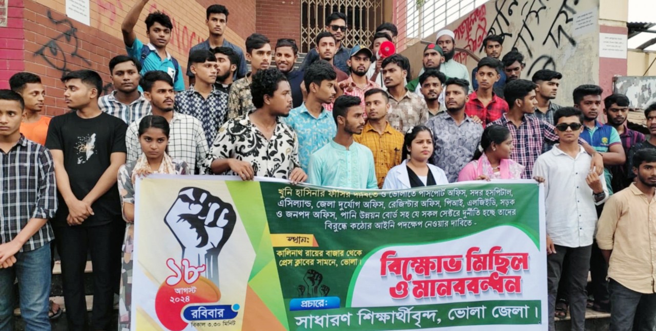 রবিবার বিকেলে সাধারণ শিক্ষার্থীদের ব্যানারে ভোলা প্রেসক্লাবের সামনে মানববন্ধন কর্মসূচি পালিত হয়। এর আগে ভোলার শিক্ষার্থীরা কালিনাথ রায়ের বাজার থেকে একটি বিক্ষোভ মিছিল বের করে। পরে মিছিলটি সদর রোড প্রদক্ষিণ করে প্রেসক্লাবের সামনে গিয়ে মানববন্ধন করে।