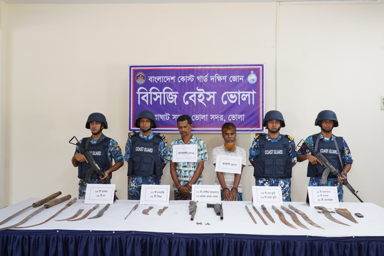 সোমবার সকালে ভোলা কোষ্টগার্ড দক্ষিণ জোন কার্যালয়ে এক প্রেস ব্রিফিংয়ে জানানো হয়, বেশকিছুদিন ধরে ভোলা জেলার সদর উপজেলাধীন তুলাতলি ও ইলিশা এলাকার মেঘনা নদীতে এবং তৎসংলগ্ন চরে মোঃ কামাল এর নেতৃত্বে একটি কুখ্যাত ডাকাত এবং মোসলেহ উদ্দিন এর নেতৃত্বে একটি সন্ত্রাসী দল স্থানীয় জনসাধারণ এবং জেলেদের জিম্মি করে চাঁদাবাজী, জমিদখল ও বিভিন্ন অপকর্ম পরিচালনা করে আসছিলো । ভুক্তভোগী স্থানীয় জনসাধারণরা কোস্ট গার্ডের নিকট সাহায্য চাইলে কোস্ট গার্ড উক্ত এলাকাসমূহে গোয়েন্দা তৎপরতা বৃদ্ধি করে। এক পর্যায়ে গোপন সংবাদের ভিত্তিতে ০৭ অক্টোবর সোমবার কোস্ট গার্ড ও বাংলাদেশ পুলিশ এর সমন্বয়ে ভোলা জেলার সদর উপজেলাধীন দক্ষিণ দিঘলদী ইউনিয়ানের রাড়ী বাড়ি এবং সদর উপজেলাধীন ইলিশা বাজার সংলগ্ন এলাকায় ০২ টি পৃথক অভিযান পরিচালনা করা হয়। এসময় পৃথক দুইটি বাড়ি তল্লাশী করে ২ টি দেশীয় আগ্নেয়াস্ত্র, ৭ রাউন্ড তাজা গোলা, বিপুল পরিমান দেশীয় অস্ত্র ও ১ টি মোবাইলসহ দুর্র্ধষ কালা ডাকাত বাহিনীর সক্রিয় সদস্য মোঃ কামাল (৫০) এবং সন্ত্রাসী মোসলেহ উদ্দিন (৫৬) কে গ্রেফতার করা হয়। গ্রেফতারকৃত ডাকাত ভোলা জেলার সদর উপজেলাধীন দক্ষিণ দিঘলদী ইউনিয়ানের রাড়ী বাড়ির বাসিন্দা মোখলেছ ও সন্ত্রাসী ভোলা জেলার সদর উপজেলাধীন ইলিশার বাসিন্দা মৃত মোজাম্মেল এর ছেলে। পরবর্তীতে আটককৃত ব্যাক্তিদ্বয়কে জব্দকৃত সকল আলামতসহ ভোলা সদর মডেল থানায় হস্তান্তর করা হয়।