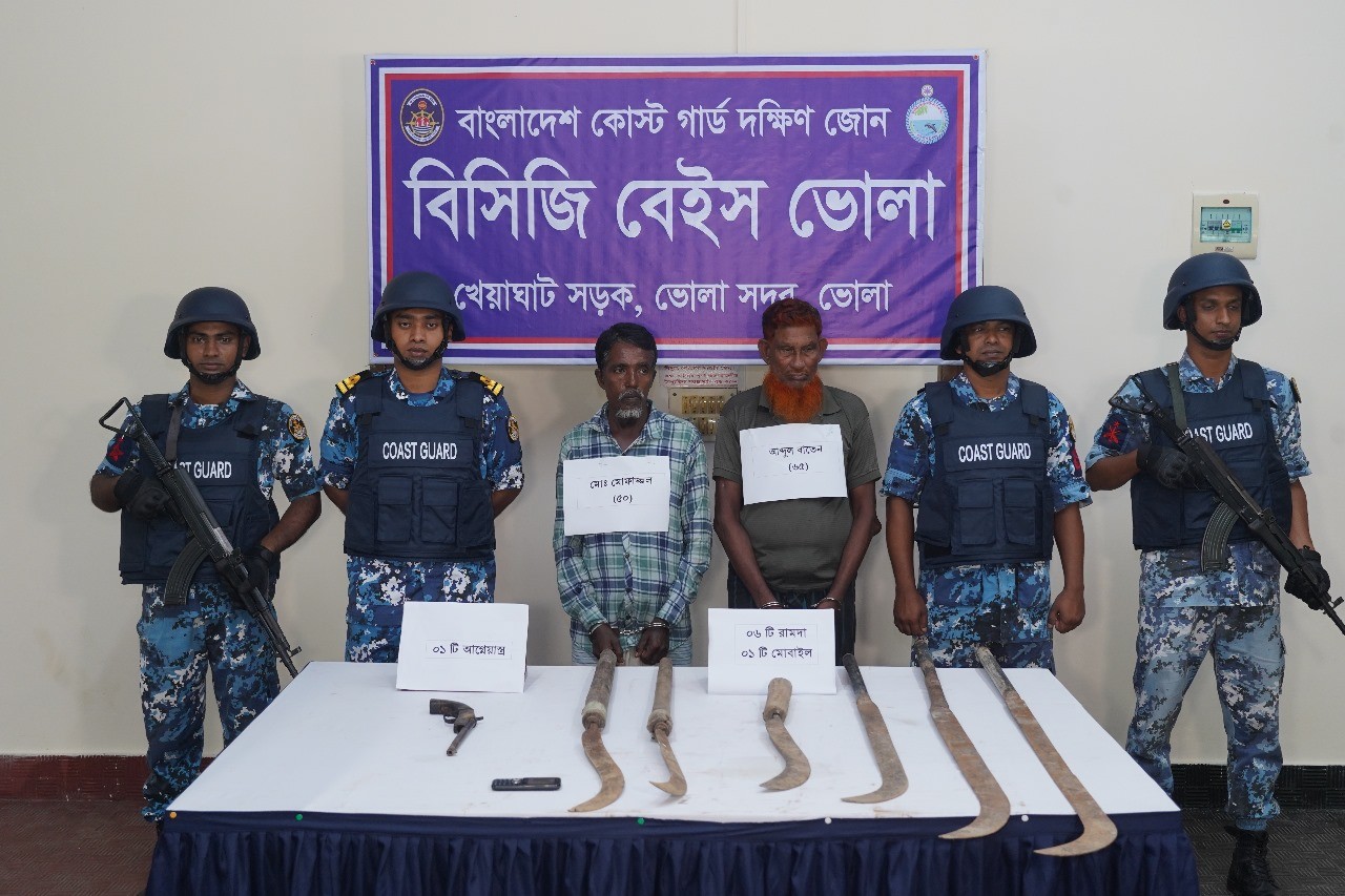 প্রেস ব্রিফিংয়ে জানানো হয়,বেশকিছুদিন ধরে ভোলা জেলার সদর উপজেলার ইলিশা এলাকার মেঘনা নদী এবং তৎসংলগ্ন চরে কুখ্যাত রাসেল বাহিনীর সক্রিয় সদস্য মোঃ মোফাজ্জল এবং আব্দুল বাতেন স্থানীয় জনসাধারণ এবং জেলেদের জিম্মি করে চাঁদাবাজী, জমিদখল ও বিভিন্ন অপকর্ম পরিচালনা করে আসছিলো। অতঃপর গোপন সংবাদের ভিত্তিতে সোমবার গভীর রাতে বাংলাদেশ কোস্ট গার্ড দক্ষিণ জোনের সদস্যরা ভোলা জেলার সদর উপজেলাধীন চর রাসেল এলাকায় একটি বিশেষ অভিযান পরিচালনা করে। এসময় দুর্র্ধষ রাসেল বাহিনীর সক্রিয় ডাকাত মোঃ মোফাজ্জল (৫৫) এবং আব্দুল বাতেনকে (৬৫) কে ১ টি আগ্নেয়াস্ত্র (পিস্তল), ৬ টি দেশীয় অস্ত্র (রামদা) ও ১ টি মোবাইলসহ আটক করা হয়। গ্রেফতারকৃত ডাকাতরা লক্ষীপুর জেলার সদর উপজেলার মধুচৌধুরি হাট ও মধ্যের চর রমনীর বাসিন্দা মৃত চয়াল এবং আব্দুল করিম এর ছেলে। পরবর্তীতে গ্রেপ্তারকৃত ডাকাতদের জব্দকৃত সকল আলামতসহ ভোলা সদর থানায় হস্তান্তর করা হয়।