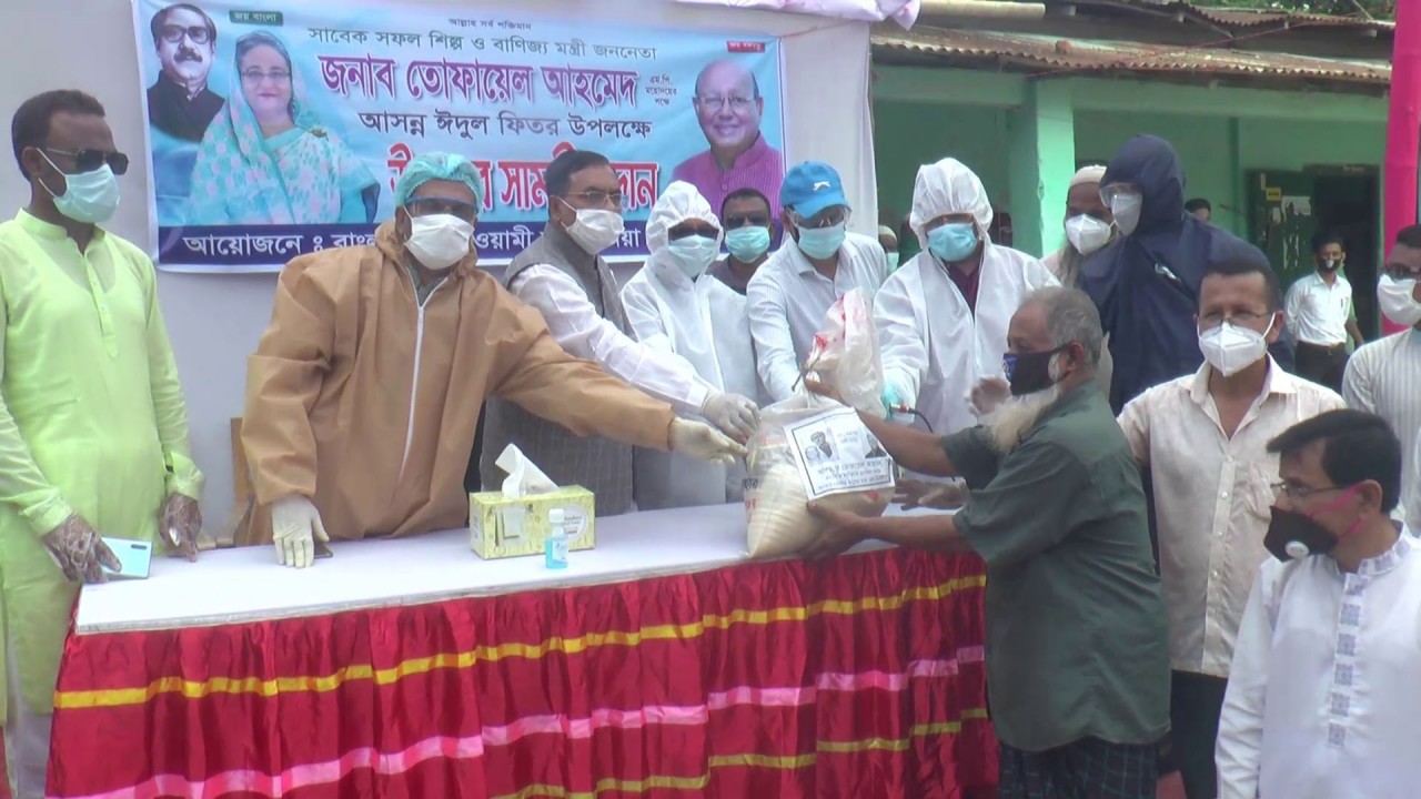 মঙ্গলবার বেলা সাড়ে ১১ টায় ভোলা সদরের ধনিয়া ইউনিয়নের ইলিয়াস মিয়া মাধ্যমিক বিদ্যালয় মাঠে কর্মহীনদের মাঝে খাদ্যসামগ্রী ও ঈদ উপহার বিতরন কালে ভিডিও কনফারেন্সে তোফায়েল আহমেদ এসব কথা বলেন। পরে তিনি তার ব্যাক্তিগত তহবিল থেকে ভোলা সদর উপজেলার ১৩ ইউনিয়নে করোনায় কর্মহীন ১০ হাজার পরিবারকে চতুর্থবারের মতো খাদ্যসামগ্রী ও ঈদ উপহার বিতরন কার্যক্রমের উদ্বোধন ঘোষনা করেন। এসময় সামাজিক দূরুত্ব রক্ষা করে ধনিয়া ইউনিয়নের অসহায় কর্মহীনদের মাঝে তোফায়েল আহমেদের ঈদ উপহার ও খাদ্যসামগ্রী তুলে দেয়া হয়। এছাড়া সদরের অন্যান্য ইউনিয়নে খাদ্যসামগ্রী ও ঈদ উপহার বিতরণ করা হয়েছে।