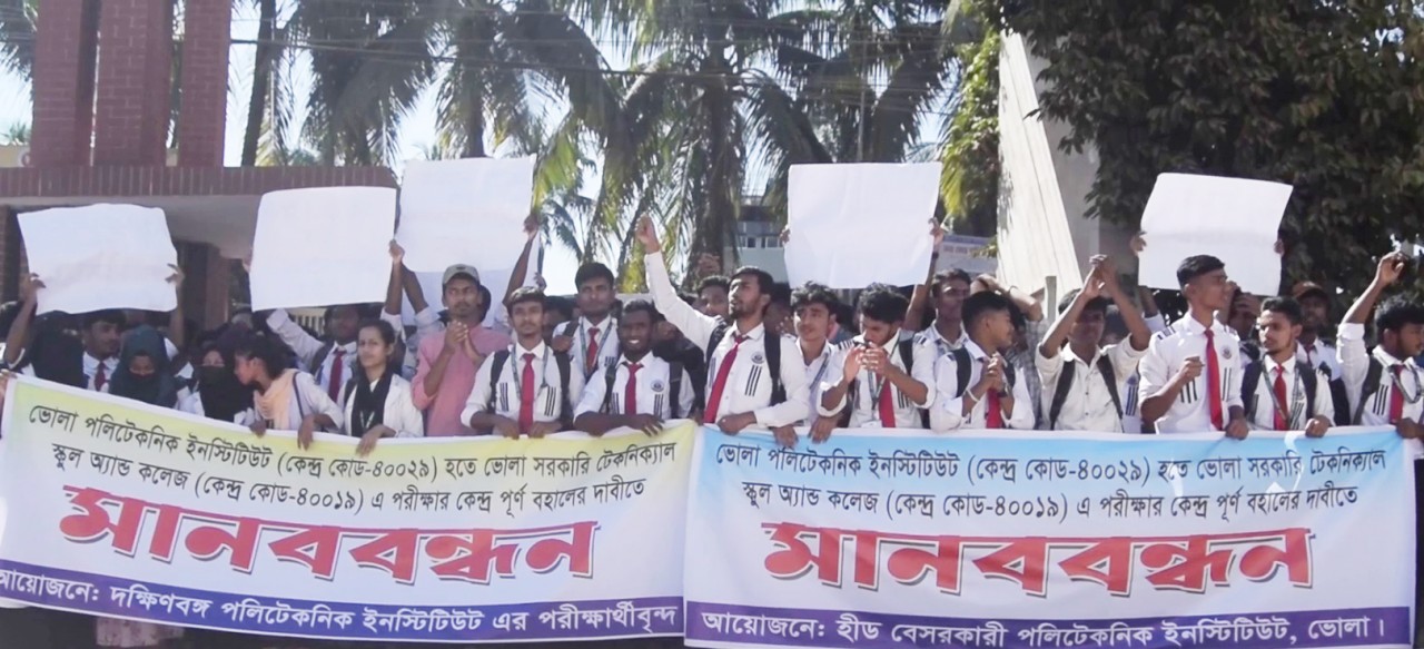 মানববন্ধন চলাকালে শিক্ষার্থীরা জানান, ২০১৬ সাল থেকে ভোলা সদর উপজেলার দক্ষিণবঙ্গ পলিটেকনিক ও হীড পলিটেকনিক ইনস্টিটিউটের ডিপ্লোমা ইন ইঞ্জিনিয়ারিং বোর্ড সমাপনী পরীক্ষা ভোলা সরকারি টেকনিক্যাল স্কুল অ্যান্ড কলেজে অনুষ্ঠিত হয়ে আসছে। এই প্রতিষ্ঠানটি শিক্ষার্থীদের জন্য সুবিধাজনক কারণ হলো কেন্দ্রটি মাত্র ২ কিলোমিটার দূরত্বে অবস্থিত এবং যাতায়াত ব্যবস্থাও ভালো। অপরদিকে গত ১০ নভেম্বর বোর্ড প্রকাশিত কেন্দ্র তালিকায় ভোলা সদর থেকে প্রায় ৩২ কিলোমিটার দূরে অবস্থিত বোরহানউদ্দিন উপজেলার ভোলা পলিটেকনিক ইনস্টিটিউটকে কেন্দ্র হিসেবে নির্বাচিত করা হয়েছে। যা শিক্ষার্থীদের জন্য সমস্যার কারণ হয়ে দাঁড়িয়েছে। ভোলা পলিটেকনিক ইনস্টিটিউট, তাদের প্রতিষ্ঠানের থেকে ৩২ কিলোমিটার দূরত্বে হওয়ার পাশাপাশি যোগাযোগ ব্যবস্থাও অনুক‚ল নয়। এতে করে যাতায়াত খরচ বৃদ্ধি পাবার পাশাপাশি শিক্ষার্থীদের জন্য পরীক্ষা কেন্দ্রে পৌঁছানো কষ্টকর হবে বলে জানান শিক্ষার্থী। শিক্ষার্থীরা মনে করছে, পরীক্ষার দিন যাতায়াতের অসুবিধা তাদের মানসিক চাপ বাড়িয়ে তুলতে পারে এবং পরীক্ষায় তাদের ফলাফলের উপর নেতিবাচক প্রভাব ফেলতে পারে। তাই সার্বিক দিক বিবেচনা করে তাদের জন্য সুবিধাজনক কেন্দ্র নির্বাচনের জন্য বোর্ড কর্তৃপক্ষের কাছে দাবি জানান তারা। এমন পরিস্থিতিতে, শিক্ষার্থীদের স্বার্থ বিবেচনায় রেখে, তারা পুনরায় ভোলা সরকারি টেকনিক্যাল স্কুল অ্যান্ড কলেজে বোর্ড সমাপনী পরীক্ষার কেন্দ্র রাখার জন্য সংশ্লিষ্ট কর্তৃপক্ষের কাছে দাবি জানান। আগামী ২৪ ঘন্টার মধ্যে শিক্ষার্থীদের দাবি মানা না হলে আরো কঠোর আন্দোলনের হুঁশিয়ারি দেন তারা।