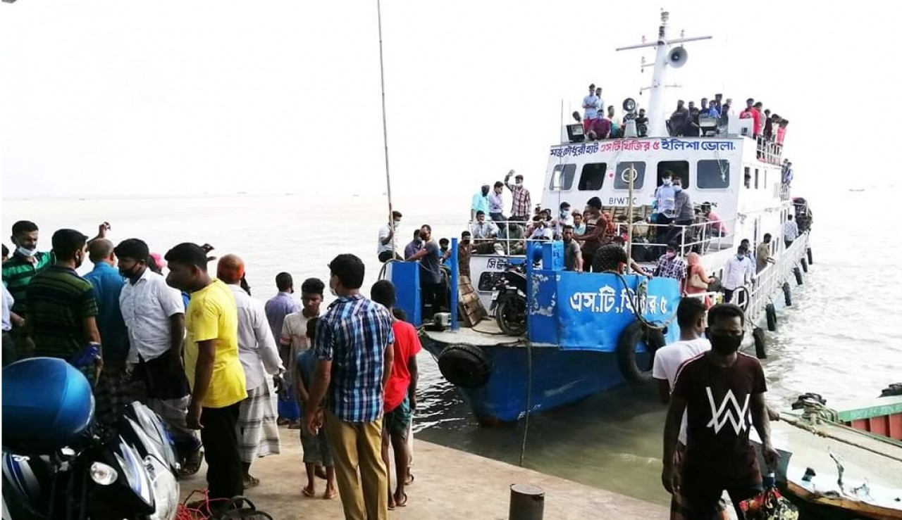 হাসিব রহমান:: ভোলার ইলিশা থেকে লক্ষীপুরের মৌজু চৌধুরীর হাট রুটে বুধবারও স্বাস্থ্য বিধি না মেনে সকাল থেকে কয়েক হাজার যাত্রী লঞ্চে,সি-ট্রাকে এবং ট্রলারে পারাপার করেছে। এতে করে ভোলার এই নৌ রুটটিতে করোনা সংক্রামন ঝুঁকি চরম আকারে দেখা দিয়েছে। তবে যাত্রীরা বলছে,নৌযান সংকটের কারনেই তারা ইচ্ছার বিরুদ্ধে ঝুঁকি নিয়ে বাধ্য হয়ে যেতে হচ্ছে। এদিকে মঙ্গলবার দৈনিক বাংলার কণ্ঠে সংবাদ প্রকাশের পর স্বাস্থ্যবিধি নামানায় ও অতিরিক্ত যাত্রী পরিবহনের দায়ে এক সি-ট্রাকের ইজারাদারকে জরিমানা করা হয়েছে।