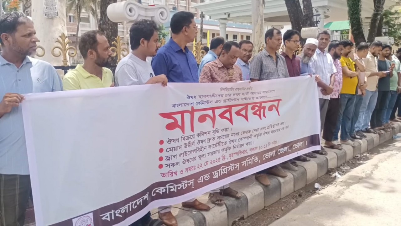 বাংলার কণ্ঠ প্রতিবেদক : ভোলায় বাংলাদেশ কেমিস্টস এন্ড ড্রাগিস্টস সমিতির চার দফা দাবী আদায়ের লক্ষ্যে মানববন্ধন কর্মসুচি অনুষ্ঠিত হয়েছে। আজ বৃহস্পতিবার সকালে ভোলা প্রেস ক্লাবের সামনে বাংলাদেশ কেমিস্টস এন্ড ড্রাগিস্টস সমিতির আয়োজনে মানববন্ধন কর্মসূচি অনুষ্ঠিত হয়।