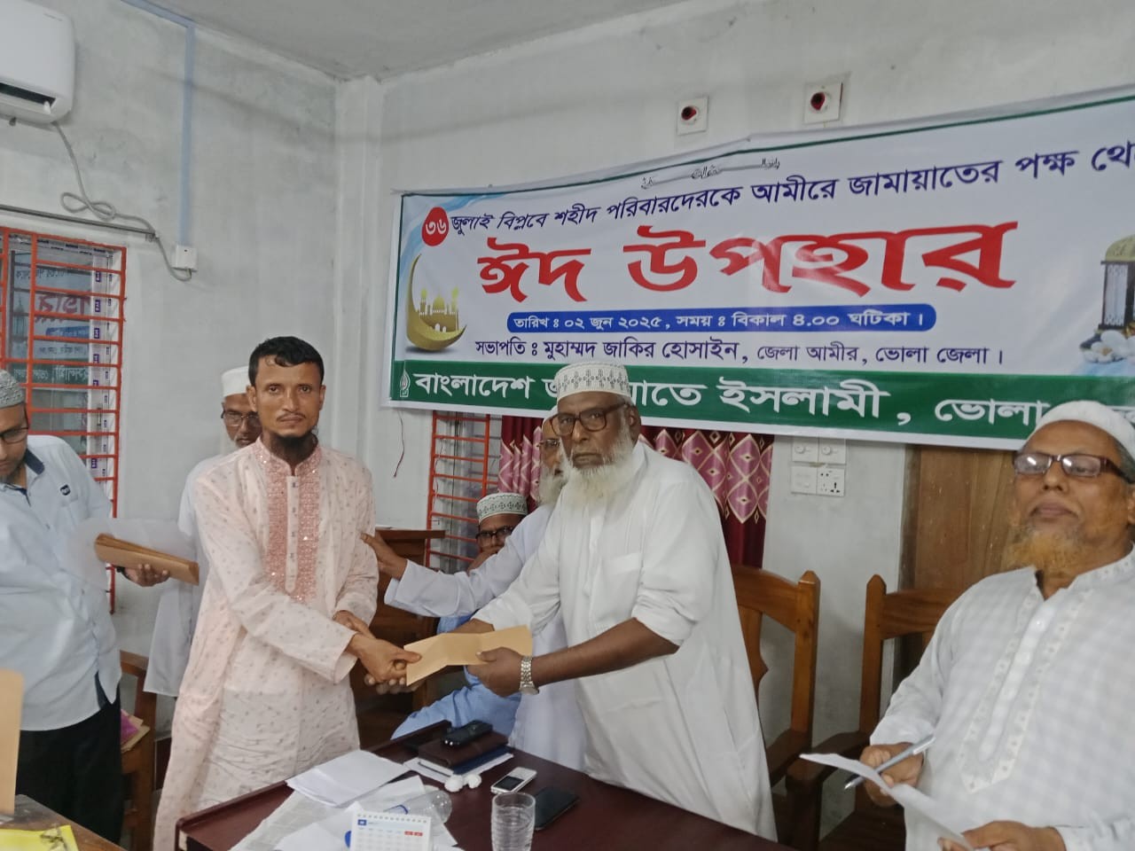 বাংলাদেশ জামায়াতে ইসলামীর ভোলা জেলা সেক্রেটারি মাওলানা হারুনুর রশিদের সঞ্চালনায় এবং জেলা আমির মাস্টার জাকির হোসাইনের সভাপতিত্বে শহীদ পরিবারকে ঈদ উপহার প্রদান অনুষ্ঠানে উপস্থিত ছিলেন, বাংলাদেশ জামায়তে ইসলামী ভোলা-১ আসনের জামায়াত মনোনীত সংসদ সদস্য প্রার্থী অধ্যক্ষ নজরুল ইসলাম, ভোলা-২ আসনের জামায়াত মনোনীত সংসদ সদস্য প্রার্থী মাওলানা ফজলুল করিম, ভোলা-৩ আসনের জামায়াত সমর্থিত প্রার্থী নিজামুল হক নাঈম, ভোলা-৪ আসনের জামায়াত মনোনীত প্রার্থী মাওলানা মোস্তফা কামাল। উপহার গ্রহণ কালে শহীদ পরিবারের সদস্যগণ বলেন, আমরা আমাদের সন্তান, স্বামী, বাবা, ভাইকে হারিয়ে শুধু একটি আশা নিয়েই অপেক্ষা করছি এই বাংলাদেশটা বৈষম্যহীন এক বাংলাদেশে পরিণত হবে। এর বিকল্প কিছুই আশা করি না।