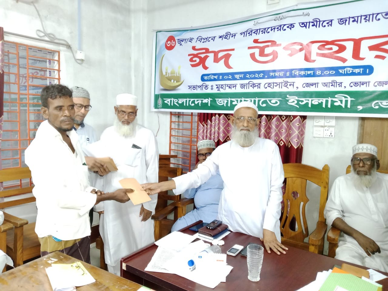 সোমবার বাংলাদেশ জামায়াতে ইসলামী ভোলা জেলা কার্যালয়ে জামায়াতের পক্ষ থেকে নগদ অর্থের মাধ্যমে এই ঈদ উপহার প্রদান করা হয়।