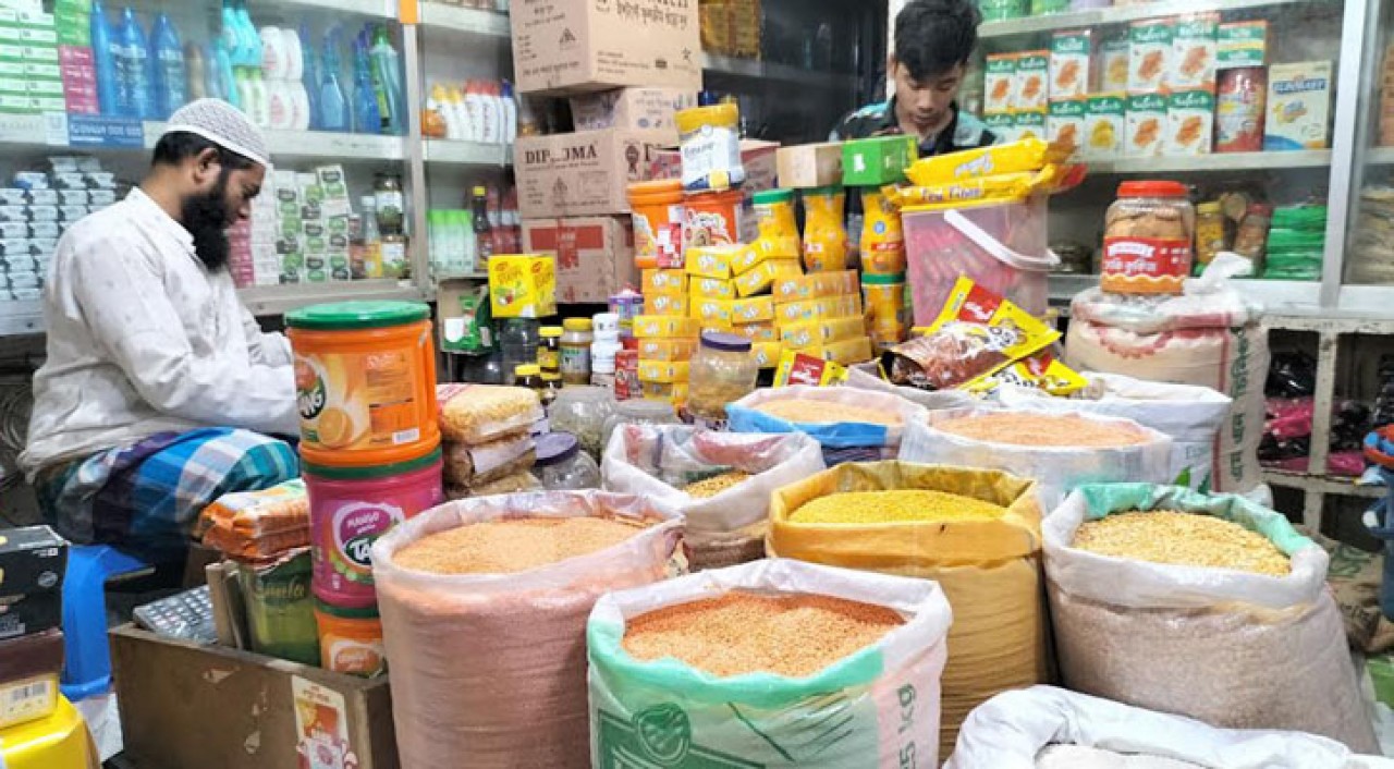 মুদিপণ্যের মধ্যে বাজারগুলোতে দেশি পেঁয়াজ ৫৫ থেকে ৬০ টাকা ও ইন্ডিয়ান পেঁয়াজ ৪৫ থেকে ৪৮ টাকা কেজি দরে বিক্রি হচ্ছে। প্রতিকেজি আদা ১৩০ থেকে ২৮০ টাকা, রসুন দেশি ১৩০ টাকা, ইন্ডিয়ান ২২০ টাকা, মসুর ডাল প্রতি কেজি ১৪০ থেকে ১৫০ টাকা, মুগ ডাল ১৬০ থেকে ১৮০ টাকা, ছোলা ১১০ টাকা, খেসারির ডাল ১৩০ টাকা দরে বিক্রি হচ্ছে। আর প্রতি কেজি খোলা চিনি ১১০ টাকা ও প্যাকেট জাত ১৪৫ টাকা, লবণ প্রতিকেজি প্রকারভেতে ৩৫ থেকে ৪৫ টাকা, বাজারে প্রতি লিটার বোতলজাত সয়াবিন তেল ১৯০ টাকা ও ৫ লিটার ৯৩০ টাকা দরে বিক্রি হচ্ছে। বাজারে এক ডজন লাল ডিম বিক্রি হচ্ছে ১৩০ টাকা, হাঁসের ডিম ২২০ টাকা ও দেশি মুরগির ডিমের হালি ৯০ টাকায় বিক্রি করতে দেখা গেছে। এছাড়া বাজার মিনিকেট চাল প্রকারভেদে ৭৮ থেকে ৮২ টাকা, নাজিরশাইল ৮২ থেকে ৯০ টাকা, স্বর্ণা ৫৫ টাকা ও ২৮ বিক্রি হচ্ছে ৬৫ টাকা কেজি দরে বিক্রি হচ্ছে।