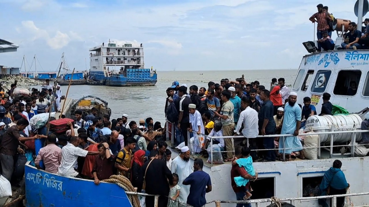 বাংলার কন্ঠ প্রতিবেদক : ঈদের ছুটি শেষে দিনে ভোলা থেকে কর্মস্থলে পরিবার পরিজন নিয়ে ফিরতে লঞ্চঘাটে হাজার হাজার মানুষ এসে জড়ো হয়েছে। শনিবার সকালে ভোলার ইলিশা লঞ্চঘাটে ছিলো সাধারণ যাত্রীদের উপচে পড়া ভীড়। ইলিশা-লক্ষীপুর রুটের লঞ্চ ও সী ট্রাক গুলোতে দুই থেকে তিনগুণ অতিরিক্ত যাত্রী ঝুঁকি নিয়ে চলাচল করে। তবে এক পর্যায়ে কোস্টগার্ড এসে বৈধ নৌযানে অতিরিক্ত যাত্রী পারাপার বন্ধ করে দেয়। নৌ যানের তুলনায় অতিরিক্ত যাত্রী হওয়াতে অনেকেই লঞ্চঘাটে অপেক্ষা করতে থাকে ঘন্টার পর ঘন্টা। আবার অনেকে জীবনের ঝুঁকি নিয়ে অবৈধ স্পিড বোট ও ট্রলারে মেঘনা নদী পাড়ি দিচ্ছেন। হুড়োহুড়ি করে সি-ট্রাকে উঠতে গিয়ে এক যাত্রী মালামাল নিয়ে নদীতে পড়ে যায়। এসময় কোস্টগার্ড দক্ষিণ জোনের সদস্যরা নদী থেকে যাত্রীদের উদ্ধার করে।