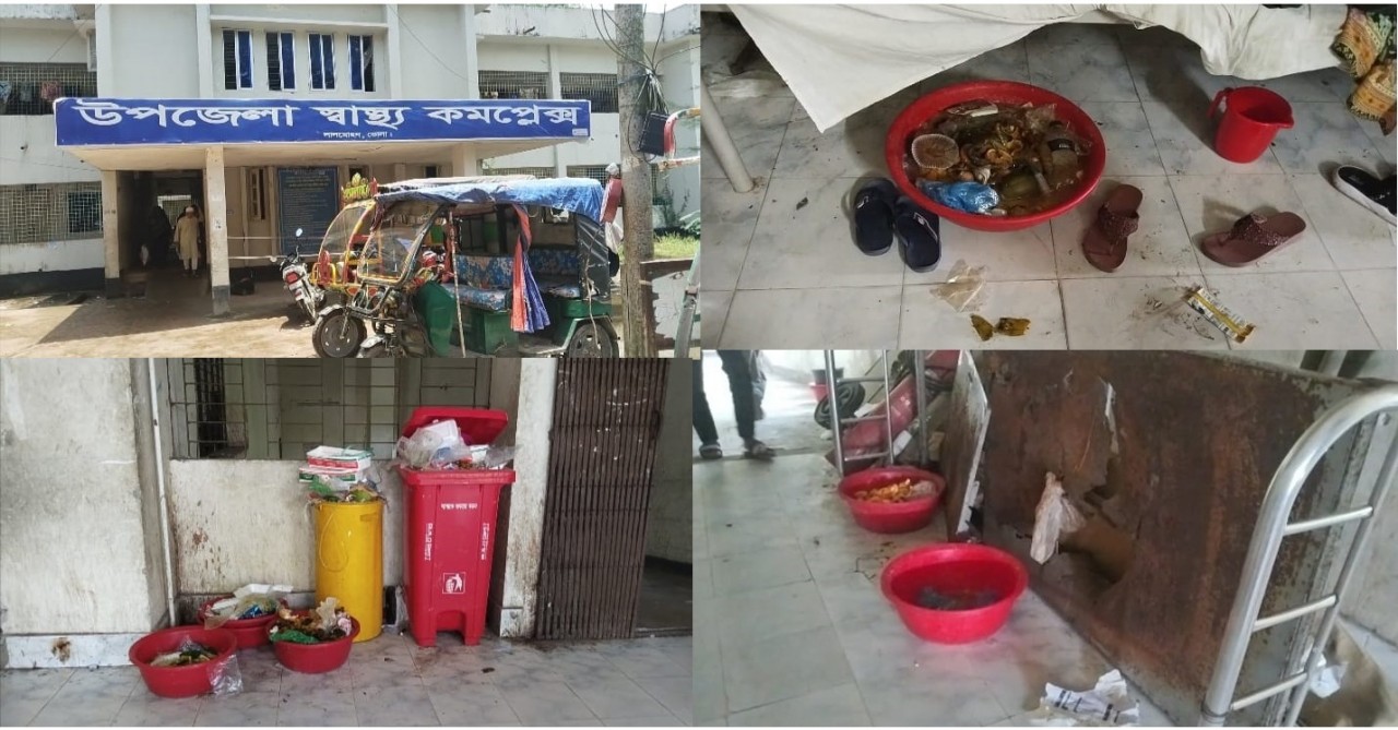 হাসপাতালের নতুন ২য় তলার সিঁড়ির সামনেই, ছড়িয়ে ছিটিয়ে পড়ে আছে ময়লা-আবর্জনা। পর্যাপ্ত ডাস্টবিন না থাকাসহ সচেতনতার অভাবে সেখানে প্রতিনিয়ত খাবারের উচ্ছিষ্ট সিঁড়ির আশেপাশে ফেলছেন রোগীর স্বজনরা। ভবনের দেয়াল ও কাঠের দরজায়ও নোংরা ময়লা লেগে আছে। ভবনের ৩য় তলার রোগীদের প্রত্যেক বেডের নিচে ময়লার স্তূপ পড়ে থাকতে দেখা গেছে। অনেক দিন পর্যন্ত পরিস্কার না করার কারণে ময়লার স্তূপ পঁচে দুর্গন্ধ ছড়াচ্ছে। ফলে দুর্গন্ধ সহ্য করে নিরুপায় হয়ে রোগী ও তার স্বজনরা কষ্ট করে বেডে থাকতে হচ্ছে। দীর্ঘদিনের ময়লা পরিষ্কার না করার কারণে এবং স্বাস্থ্য কমপ্লেক্সের কর্তৃপক্ষ কোনো ব্যবস্থা না নেওয়ায় ক্ষুব্ধ রোগী এবং তাদের স্বজনরা।