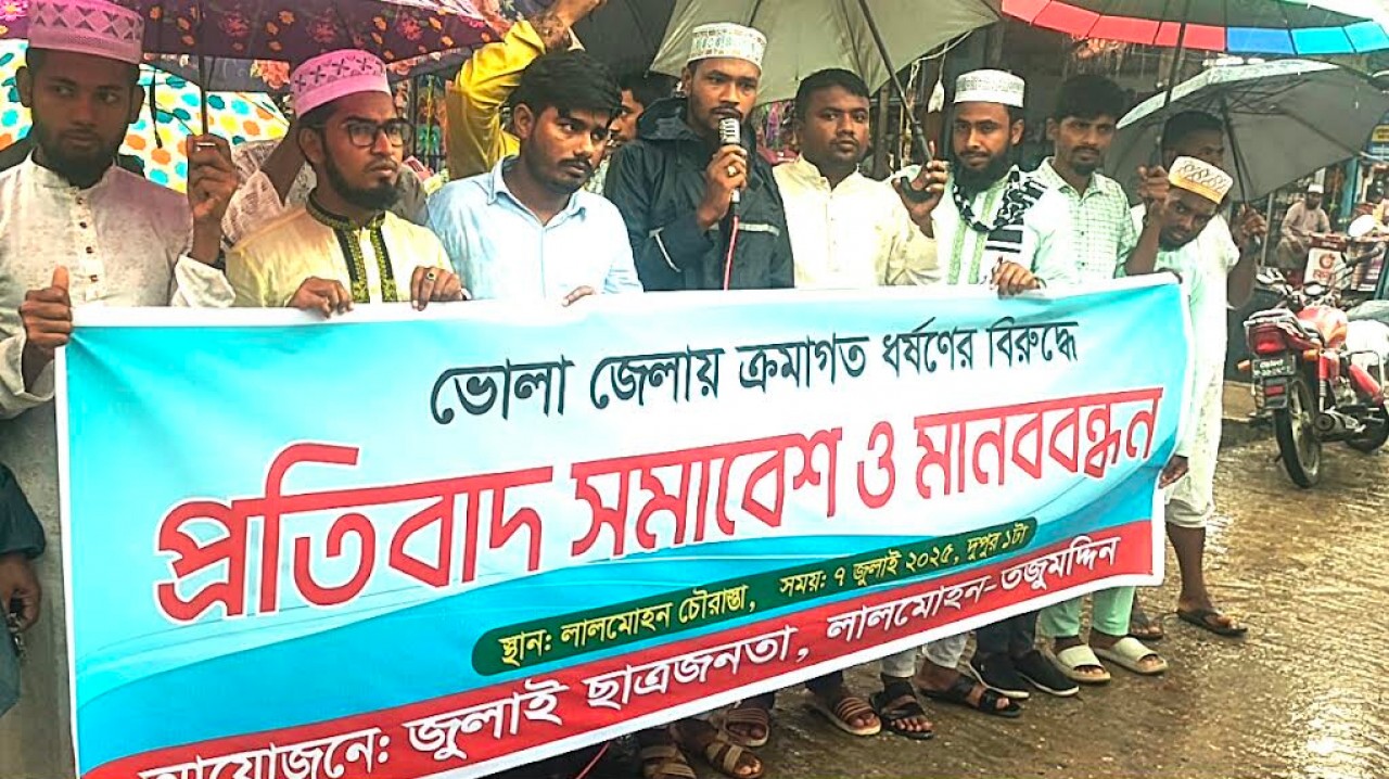লালমোহন প্রতিনিধি: ভোলার বিভিন্ন স্থানসহ দেশব্যাপী ধর্ষণ ও সামাজিক অপরাধ বৃদ্ধির ঘটনায় উদ্বেগ প্রকাশ করে প্রতিবাদ সমাবেশ ও মানববন্ধন করেছে জুলাই ছাত্র-জনতা। সোমবার দুপুরে লালমোহন চৌরাস্তা মোড়ে বৃস্টি উপেক্ষা করে প্রতিবাদ সমাবেশ ও মানববন্ধনে বক্তারা ক্রমাগত ধর্ষণের বিরুদ্ধে রুখে দাঁড়ানোর আহবান জানান।
