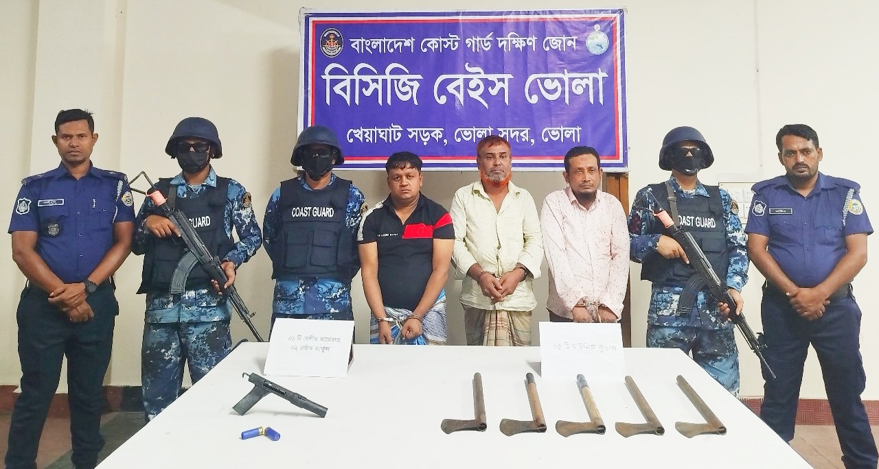 বাংলার কণ্ঠ প্রতিবেদক: ভোলায় কোষ্টগার্ডৈর যৌথ অভিযানে ১টি দেশীয় আগ্নেয়াস্ত্র, ২ রাউন্ড তাজা কার্তুজ ও ৫ টি চাইনিজ কুড়ালসহ আওয়ামী লীগের ৩ নেতা কে আটক করা হয়েছে।