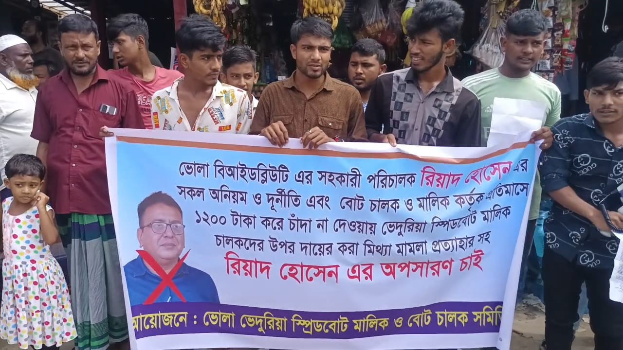 তাদের অভিযোগ ভোলার নদী বন্দরের সহকারী পরিচালক মো: রিয়াদ হোসেন ভোলায় যোগদারের পর থেকেই অনিয়ন ও দুর্নীতি মাধ্যমে স্প্রিটবোট মালিকদের কাছ থেকে বিভিন্ন অজুহাত দেখিয়ে টাকা আদায় করছেন। এর প্রতিবাদ করলে তাদেরকে মামলার ভয় দেখান। অনেকের নামে মামলা দেয়া হয়েছে।