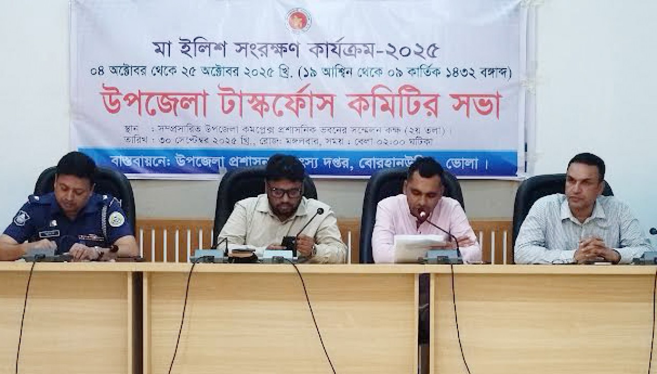 মোঃ মহিউদ্দিন আজিম, বোরহানউদ্দিন : বোরহানউদ্দিন উপজেলার মেঘনা ও তেঁতুলিয়া নদীতে মা ইলিশ সংরক্ষণে "মা ইলিশ সংরক্ষণ কার্যক্রম - ২০২৫ উপলক্ষে উপজেলা টাস্কর্ফোস কমিটির সভা অনুষ্ঠিত হয়েছে।